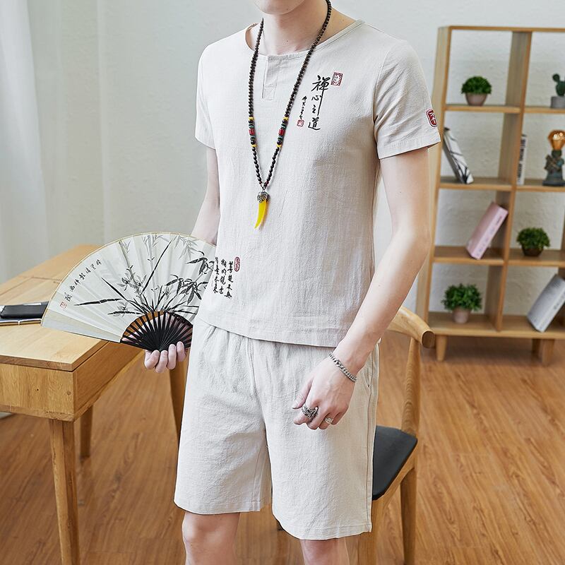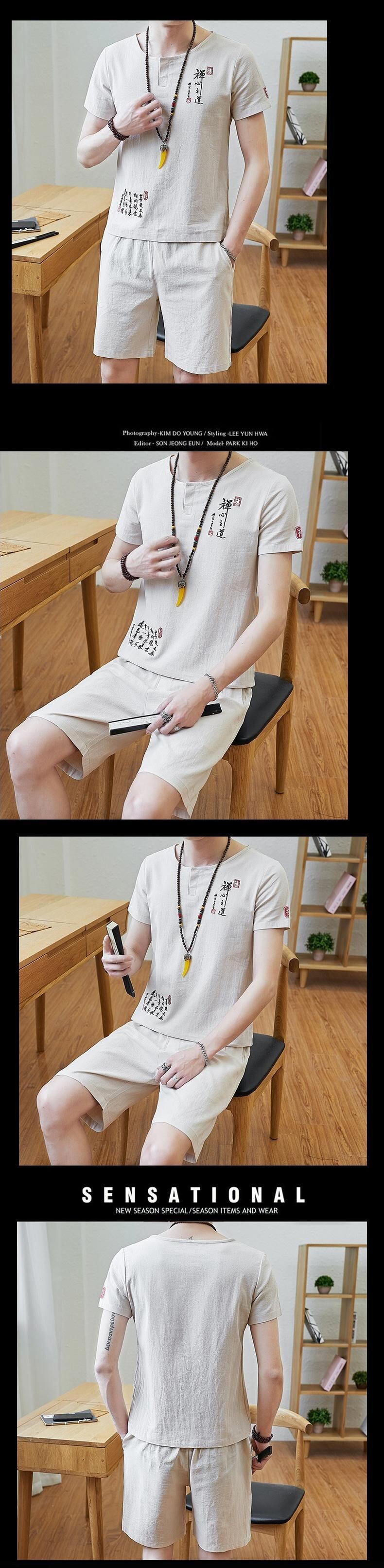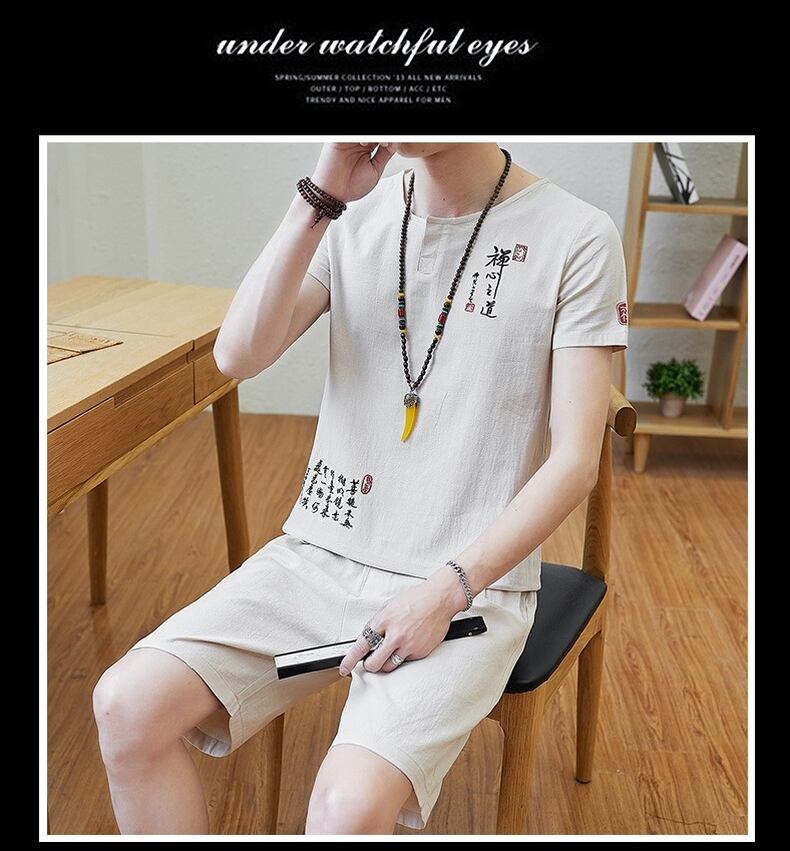 Chinese style suit men's national tide embroidery loose linen short-sleeved summer thin cotton and linen t-shirt five-point pants two-piece set コットン 刺繍 サマー 夏物 Tシャツ doushi55062977925
