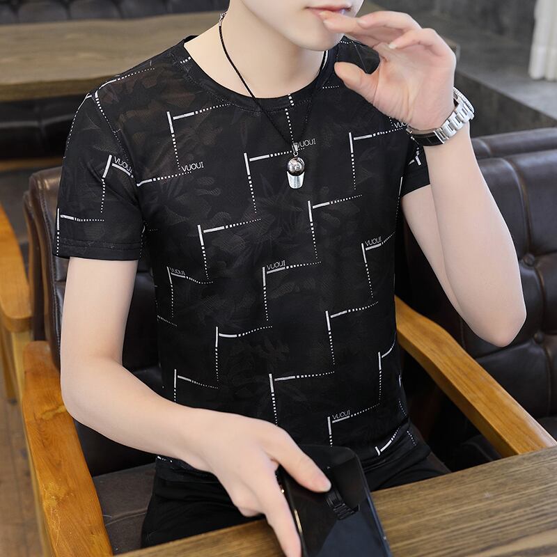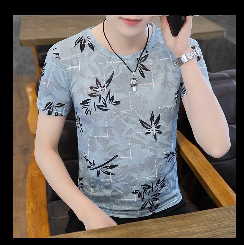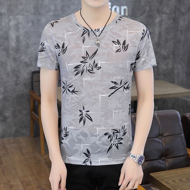 Ice silk t-shirt men's short-sleeved mulberry silk round neck printing t-shirt hollow tide brand personality fashion trend slim half-sleeve Oネック スリム シルク Tシャツ doushi56418671936