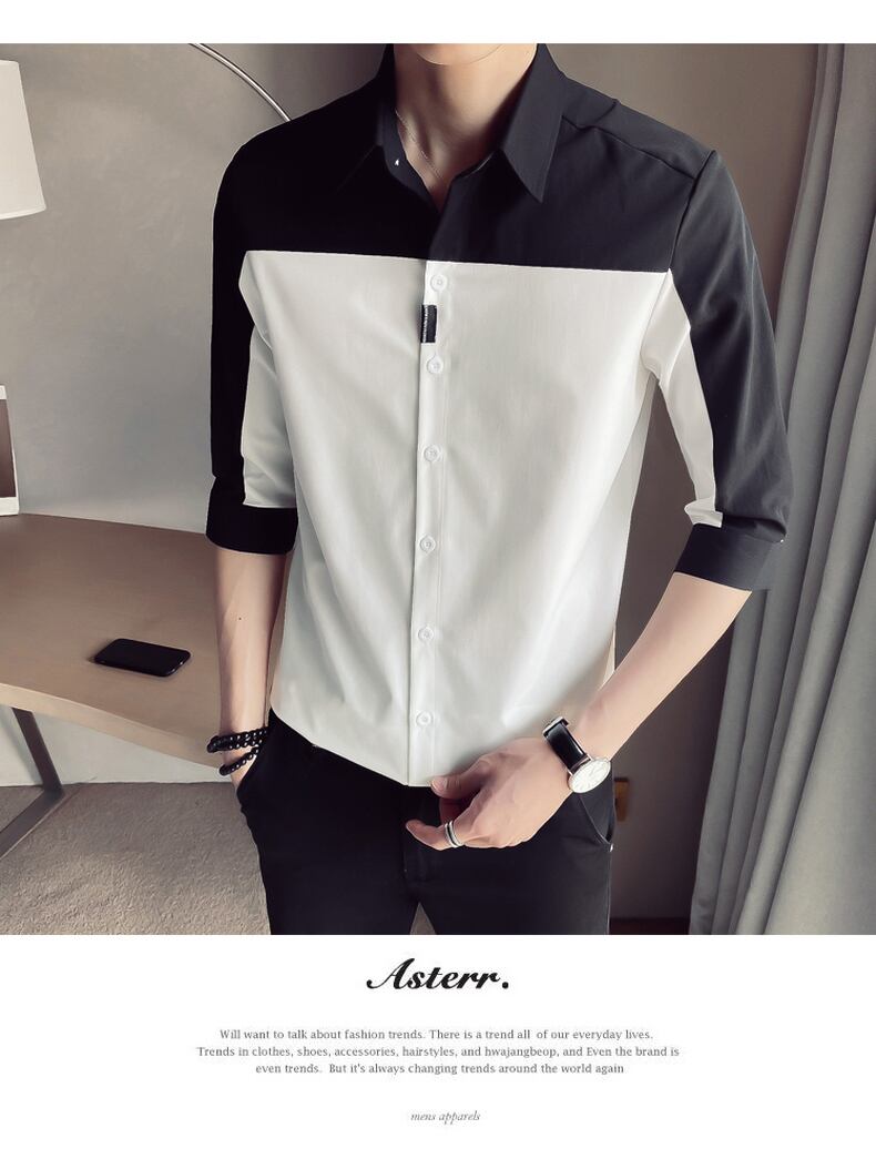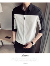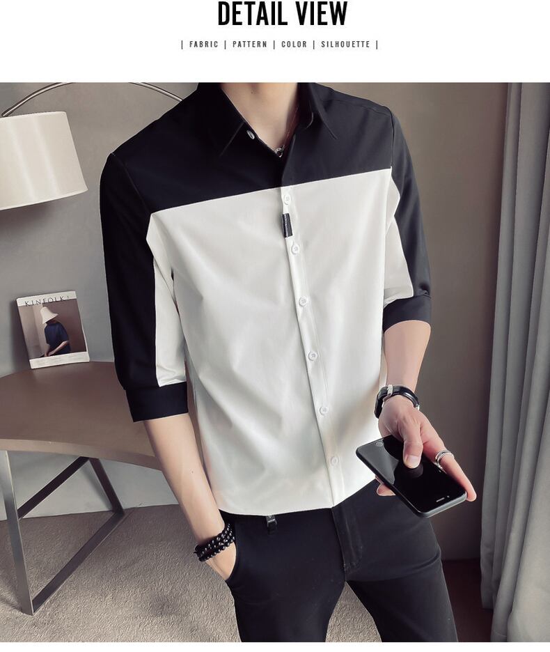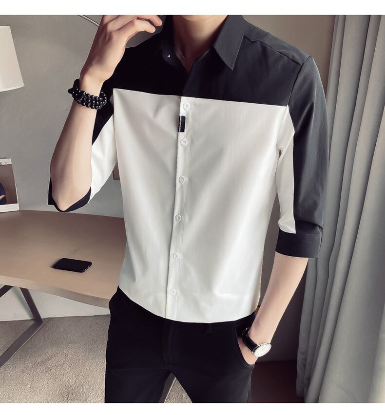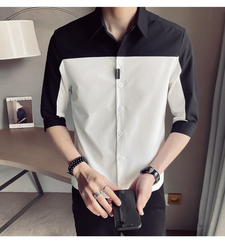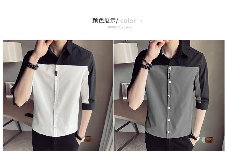 Summer short-sleeved stitching shirt men's trendy three-quarter sleeves version of the slim design inch shirt handsome mid-sleeve casual shirt カジュアル サマー 夏物 スリム ステッチ doushi56649129282