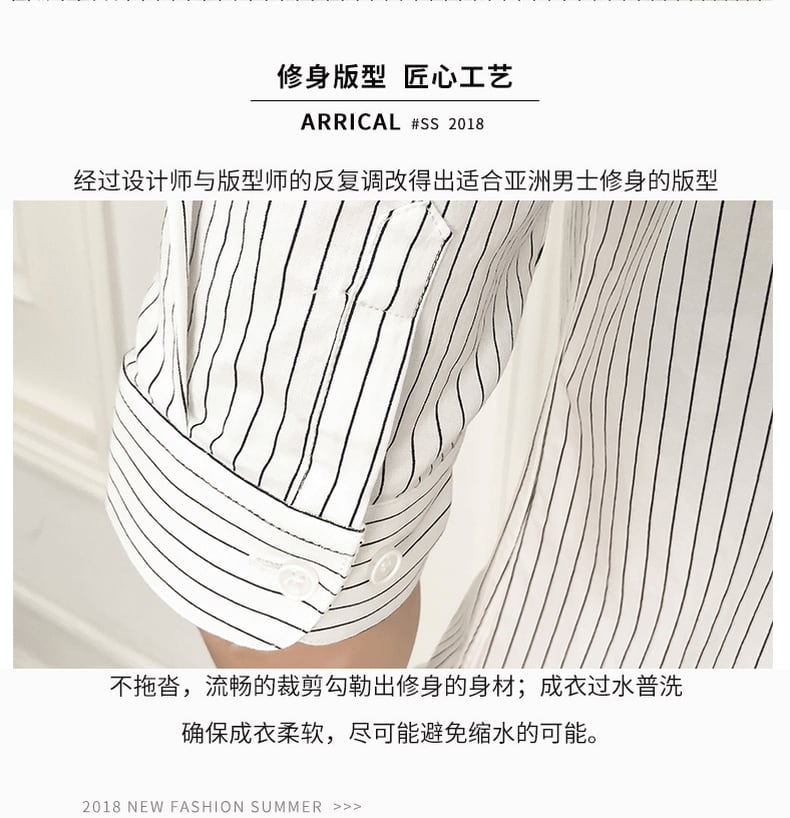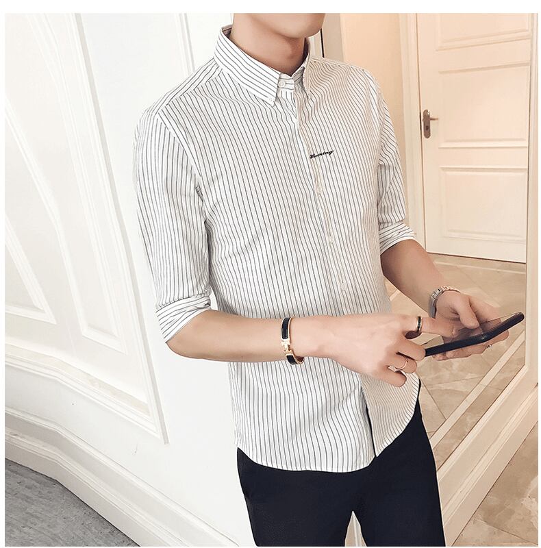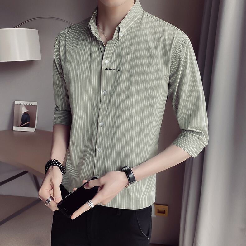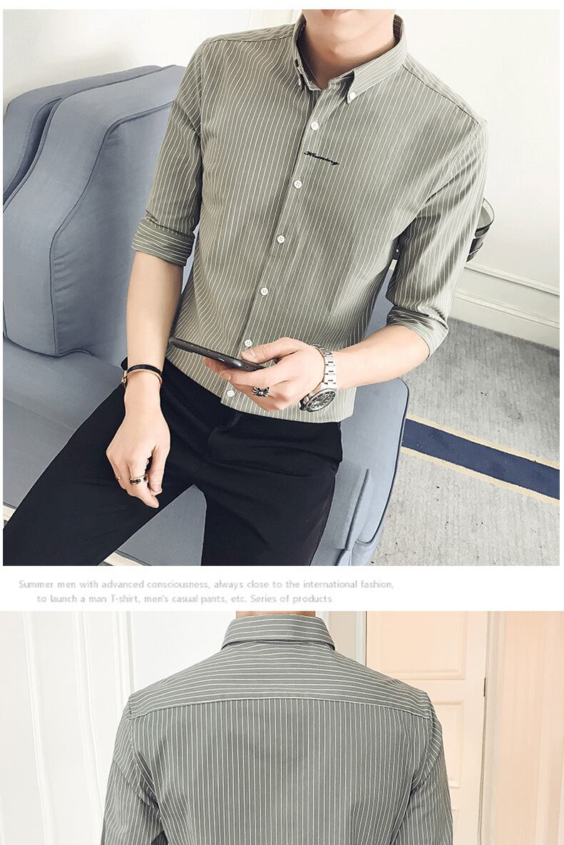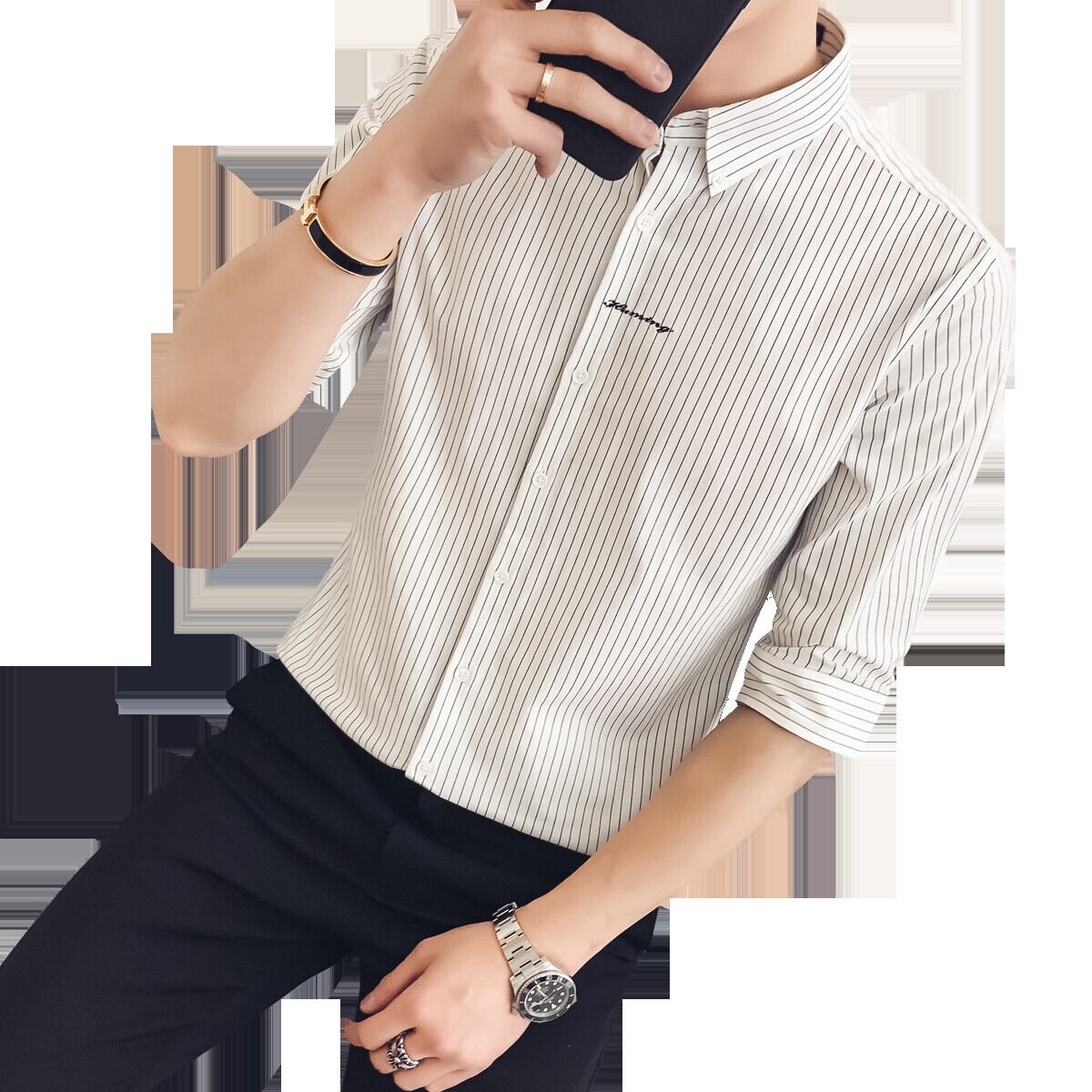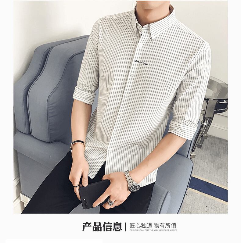 Summer striped shirt men's thin short-sleeved ice silk 7 seven-point mid-sleeve shirt slim trend ruffian handsome inch shirt men サマー 夏物 ストライプ スリム シルク doushi9060180847