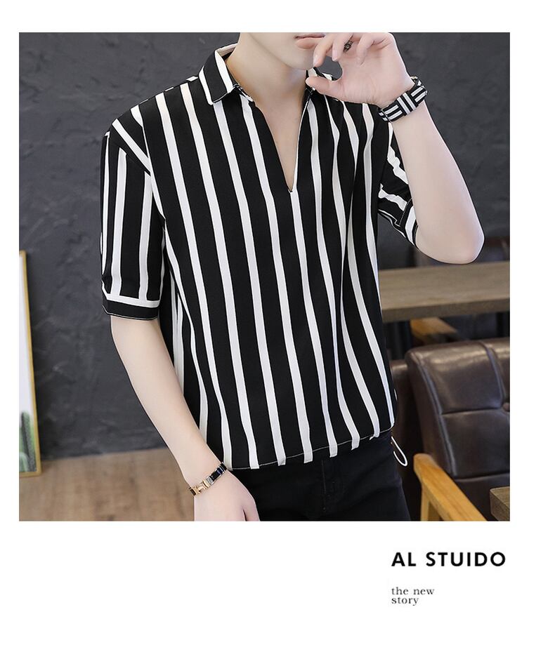 Summer short-sleeved shirt men's version loose trend medium-sleeve striped top Hong Kong style social boy handsome shirt サマー 夏物 ストライプ doushi74786684658