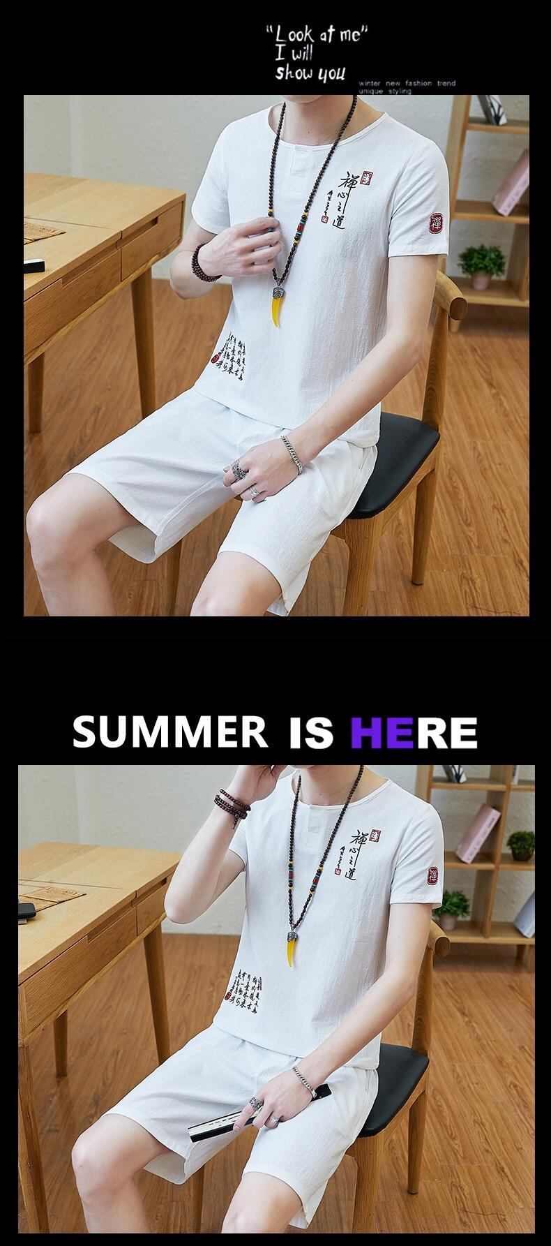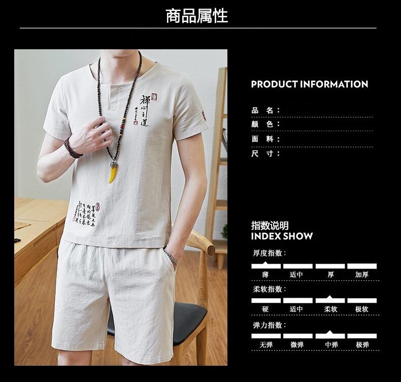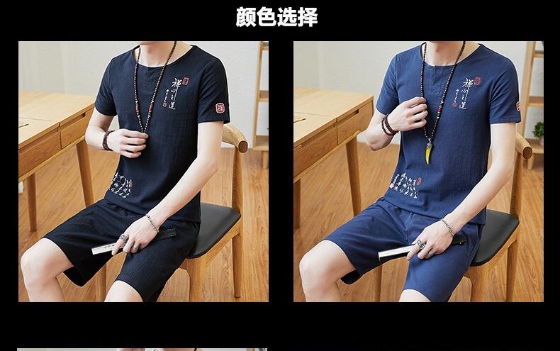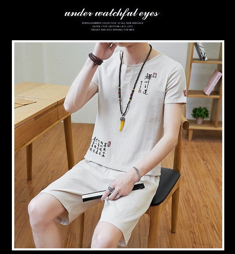 Summer short-sleeved t-shirt men's cotton and linen suit Chinese style loose V-neck half-sleeved shorts two-piece set with trend コットン サマー 夏物 ショーツ ブルマー Vネック Tシャツ doushi13145639197