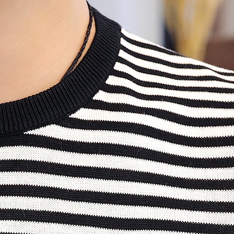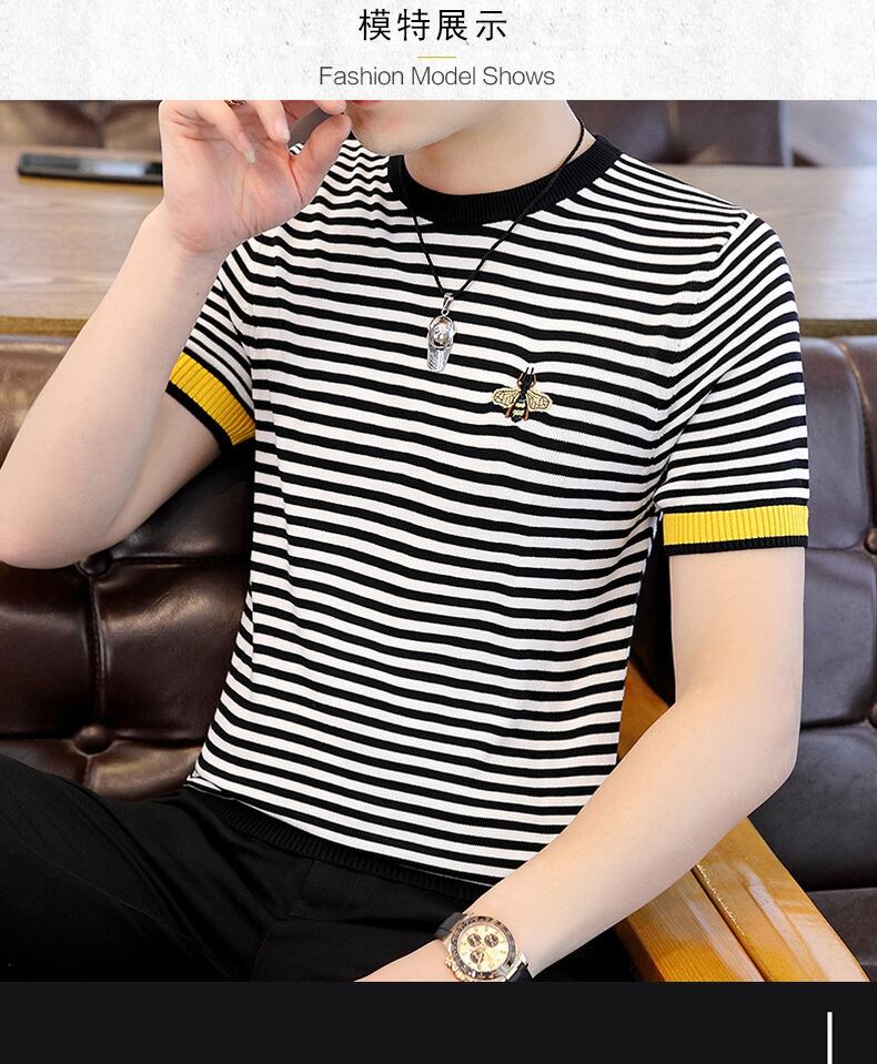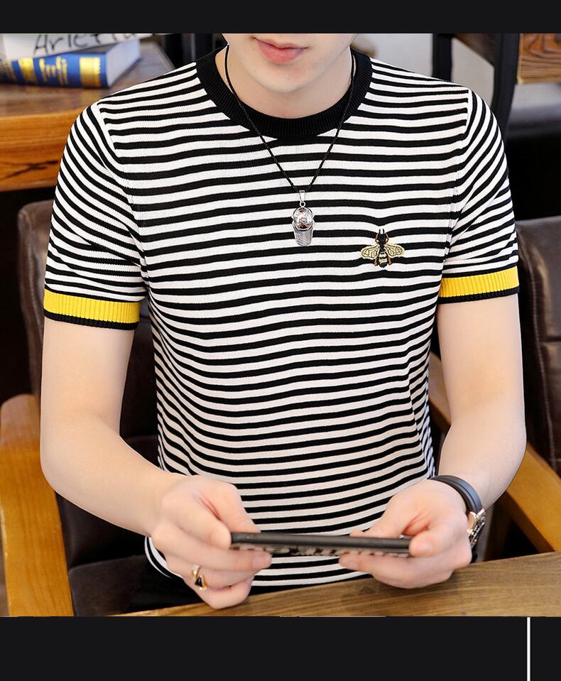 Short-sleeved T-shirt men's summer version of the slim striped ice silk sweater thin section European station trend bee embroidery t-shirt 刺繍 サマー 夏物 ストライプ スリム シルク Tシャツ ヨーロピアン doushi10460193060