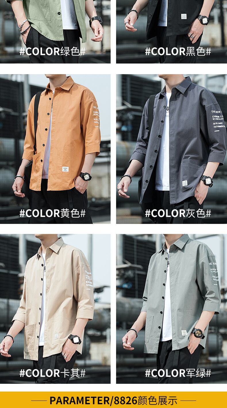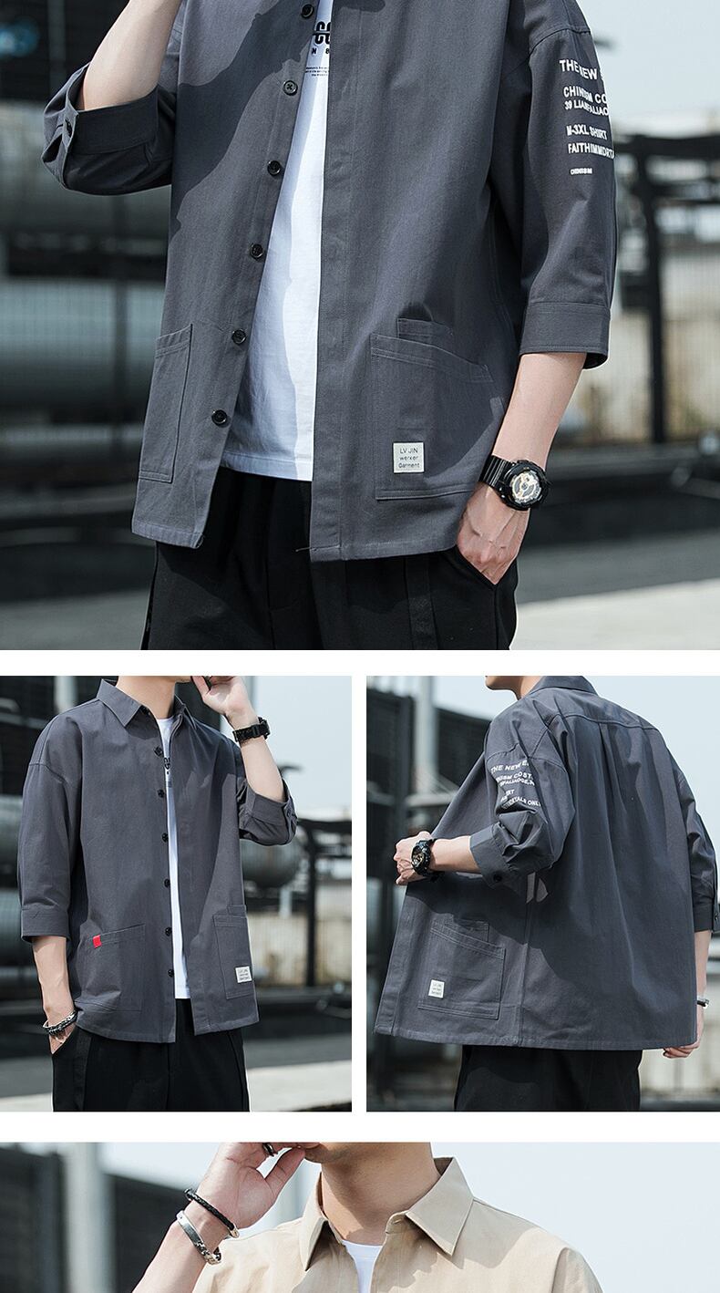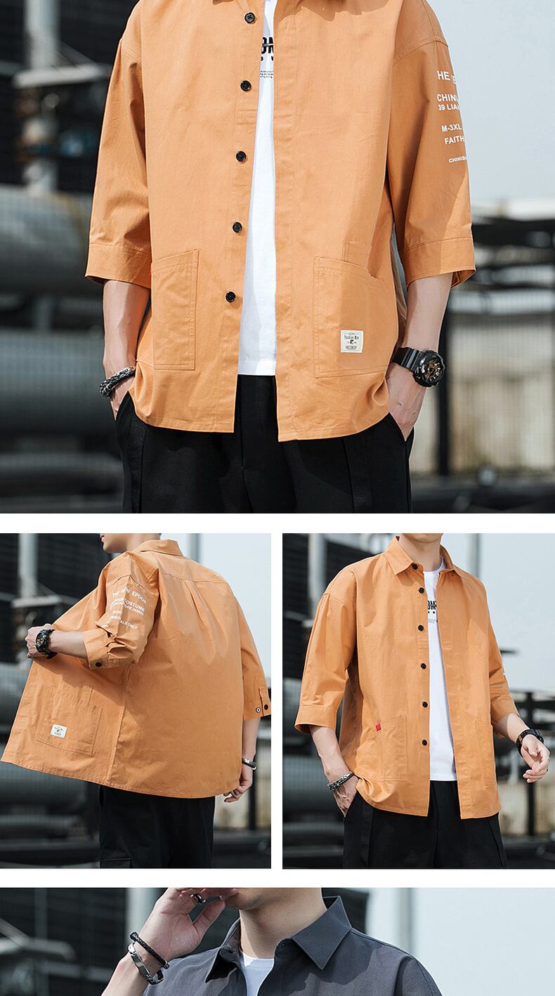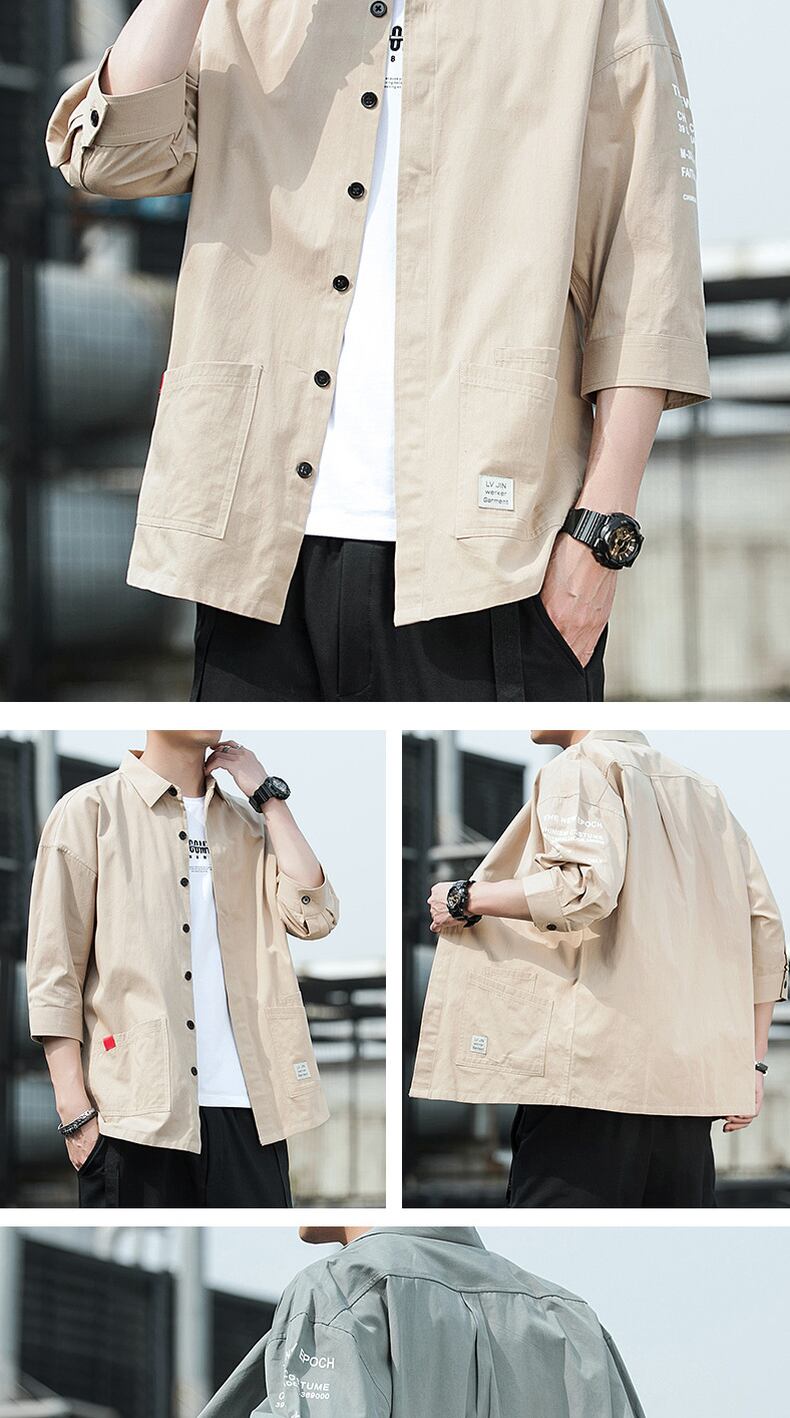Cotton short-sleeved shirt men's version trend three-quarter sleeve shirt summer ruffian handsome loose tooling casual jacket コットン カジュアル サマー 夏物 doushi38535631102