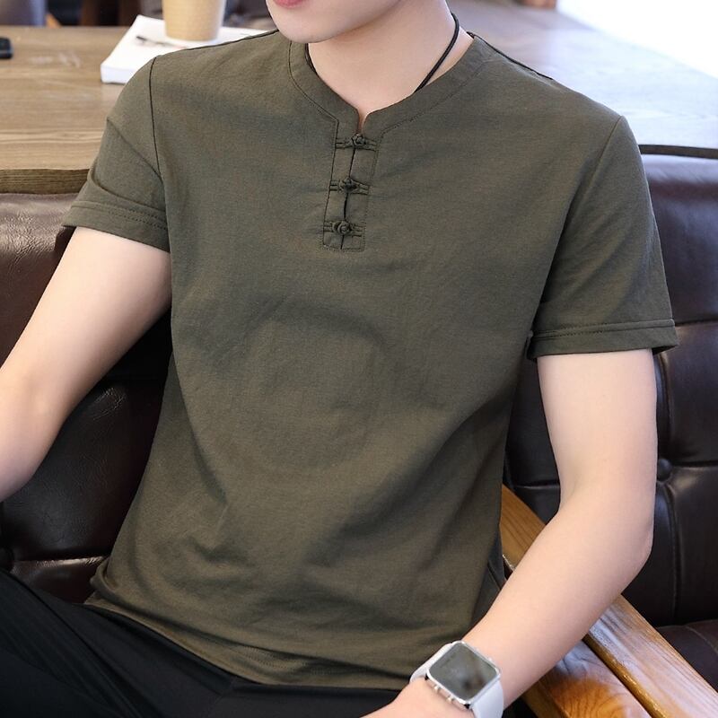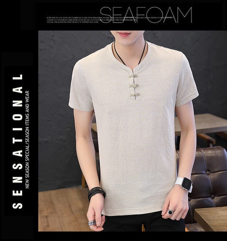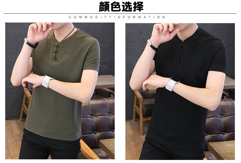 2022 summer trend personality trendy men's short-sleeved T-shirt version slim V-neck half-sleeved cotton and linen clothes Chinese style men's clothing コットン サマー 夏物 Vネック スリム Tシャツ doushi20024081137