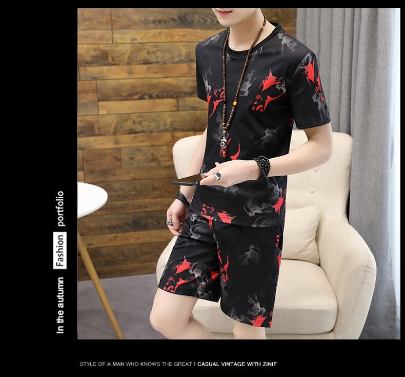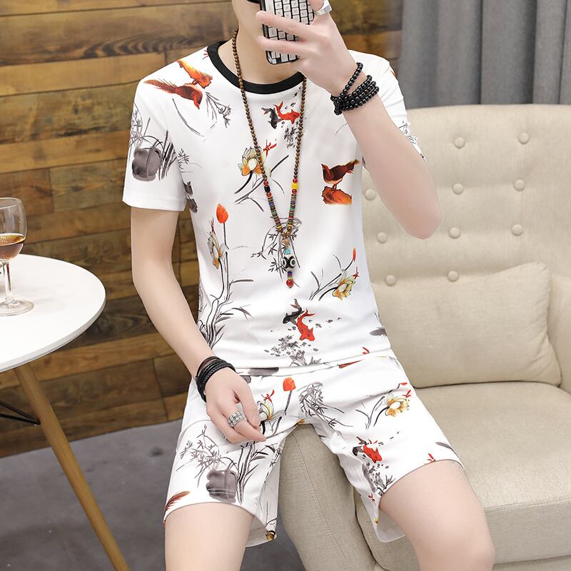 Ice silk short-sleeved t-shirt summer men's trend sports and leisure suit with handsome shorts tide brand clothes set サマー 夏物 ショーツ ブルマー シルク Tシャツ doushi82962856767