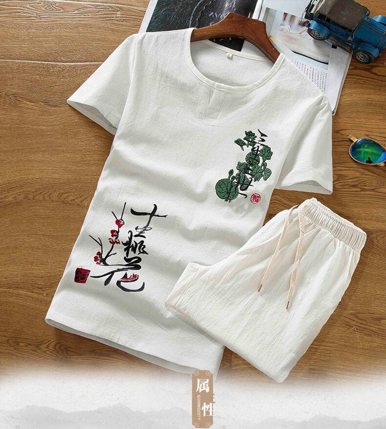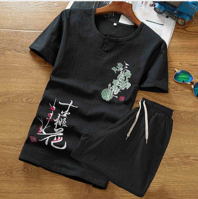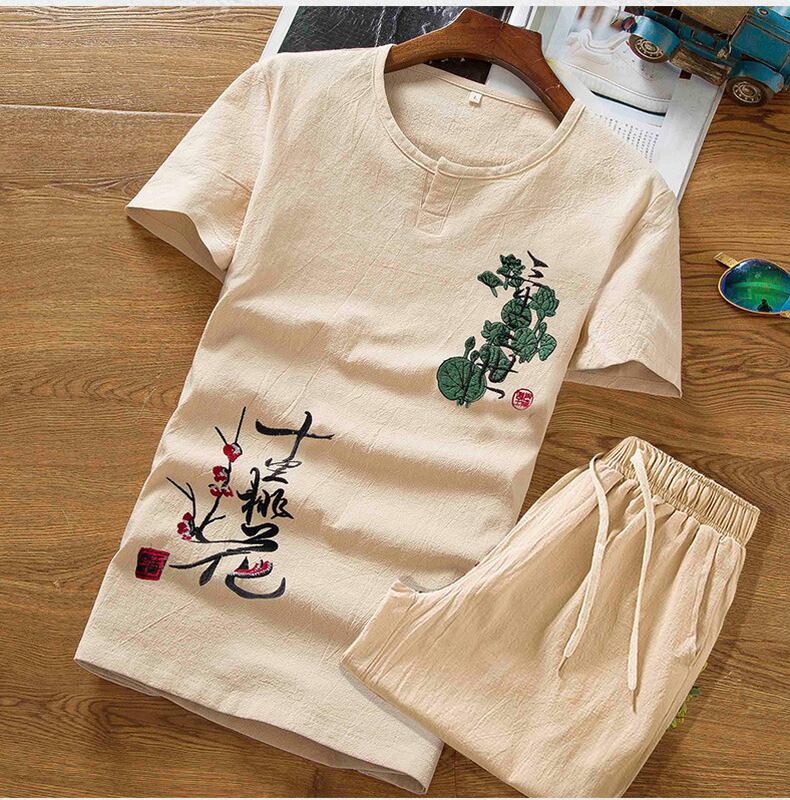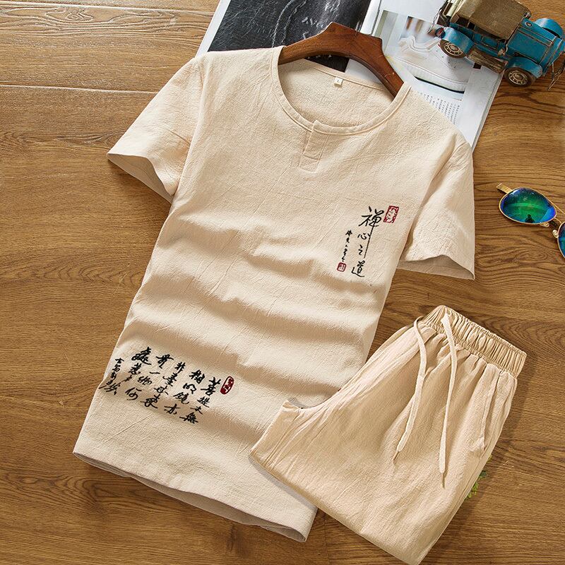 Linen suit men's short-sleeved summer thin t-shirt Chinese style men's cotton and linen embroidered casual clothes a set レッド コットン カジュアル 刺繍 サマー 夏物 Tシャツ doushi43123875137