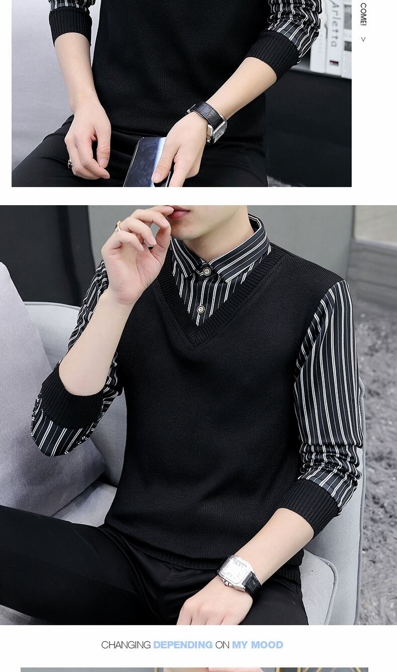 Fake two-piece sweater men's spring, autumn and winter trend striped shirt collar sweater tide brand plus velvet thick sweater スプリング 春物 オータム 秋物 ウィンター 冬物 ストライプ doushi47269275182