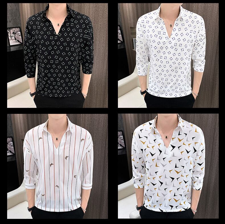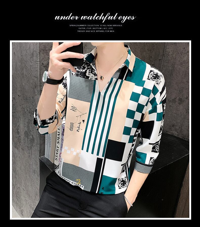 Summer net red very fairy plaid shirt men's short-sleeved t-shirt V-neck chiffon ice silk mid-sleeve shirt men's version of the tide レッド シフォン サマー 夏物 Vネック シルク Tシャツ doushi22985510800