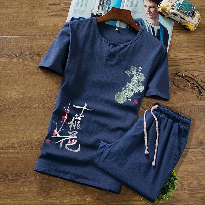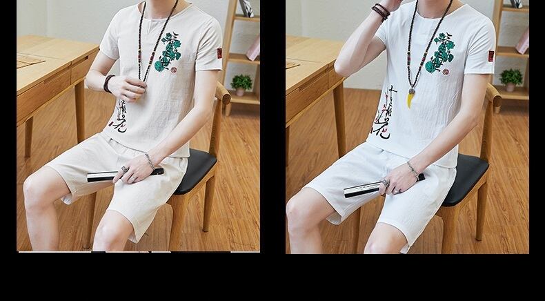 Summer Chinese style linen suit men's Hanfu cotton linen short-sleeved t-shirt men's Tang suit Zen suit men's ancient costume clothes v コットン サマー 夏物 Tシャツ doushi89583701047