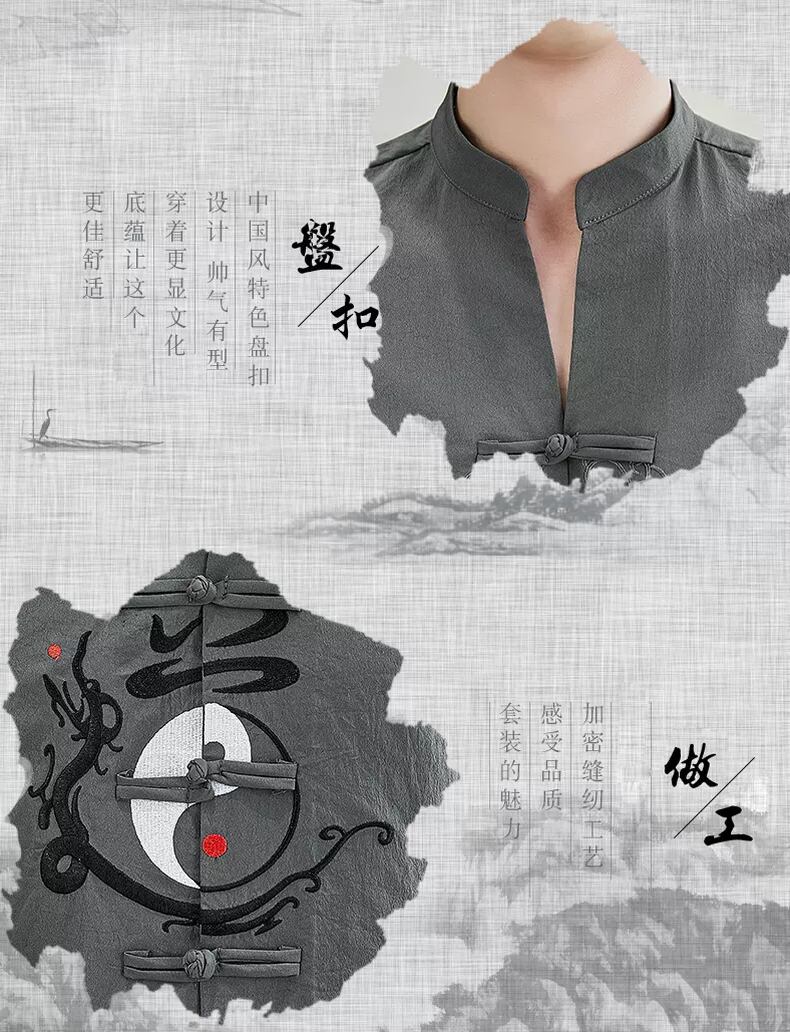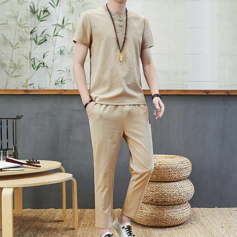 Summer Chinese style linen suit men's plus size short-sleeved t-shirt trend casual retro style Tang suit set レトロ カジュアル 大きめサイズ サマー 夏物 Tシャツ doushi70761568037
