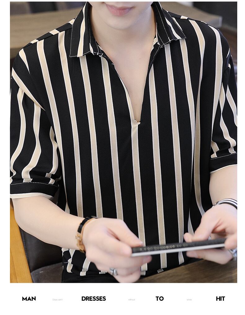 Summer net red very fairy striped shirt men's short-sleeved t-shirt V-neck chiffon ice silk mid-sleeve shirt men's version of the tide レッド シフォン サマー 夏物 Vネック ストライプ シルク Tシャツ doushi88722347355