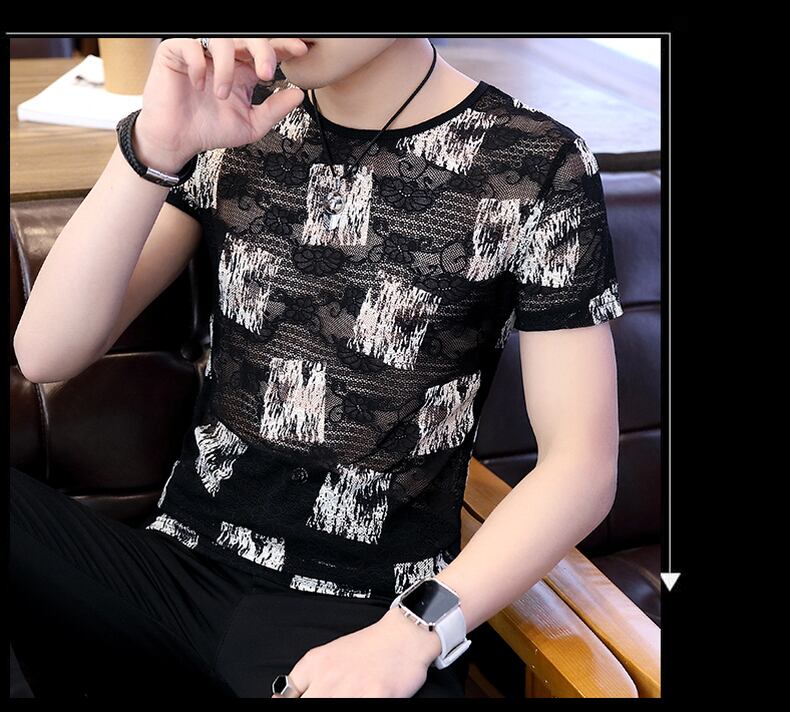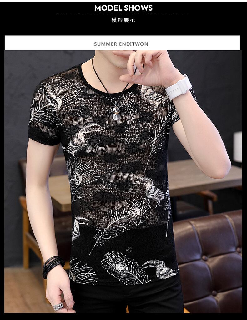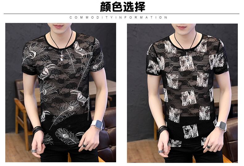 Ice silk short-sleeved men's trendy personality thread air top clothes men's breathable thin section trend slim flower t-shirt men's t-shirt スリム シルク Tシャツ フラワーデザイン doushi58939121915