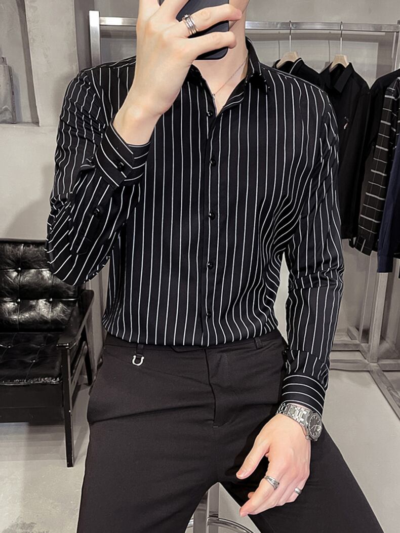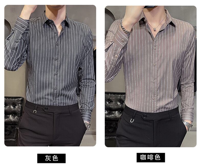 Spring and autumn high-end gray striped shirt men's long-sleeved business casual shirt men's slim fit non-iron shirt ロング カジュアル スプリング 春物 オータム 秋物 ストライプ スリム doushi40445297944