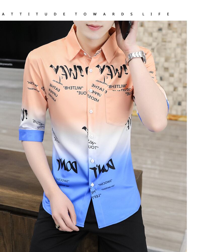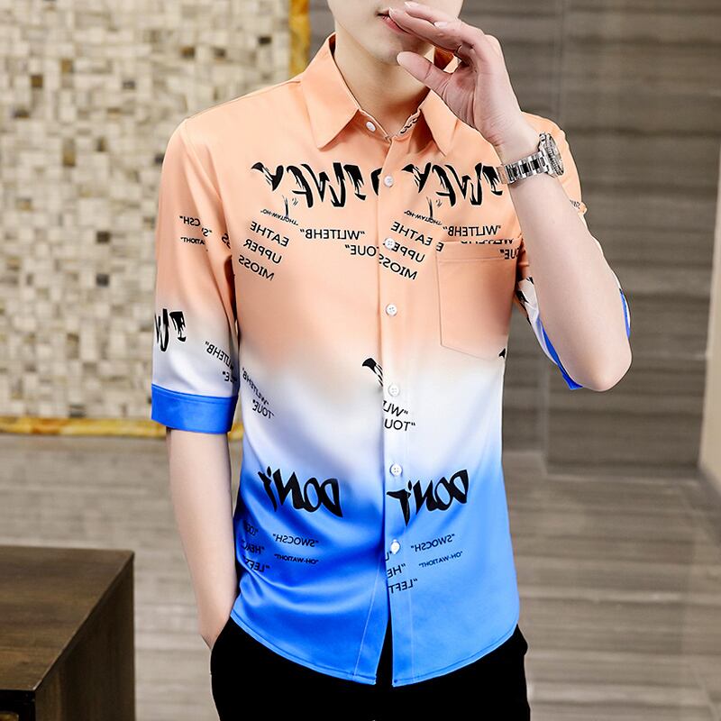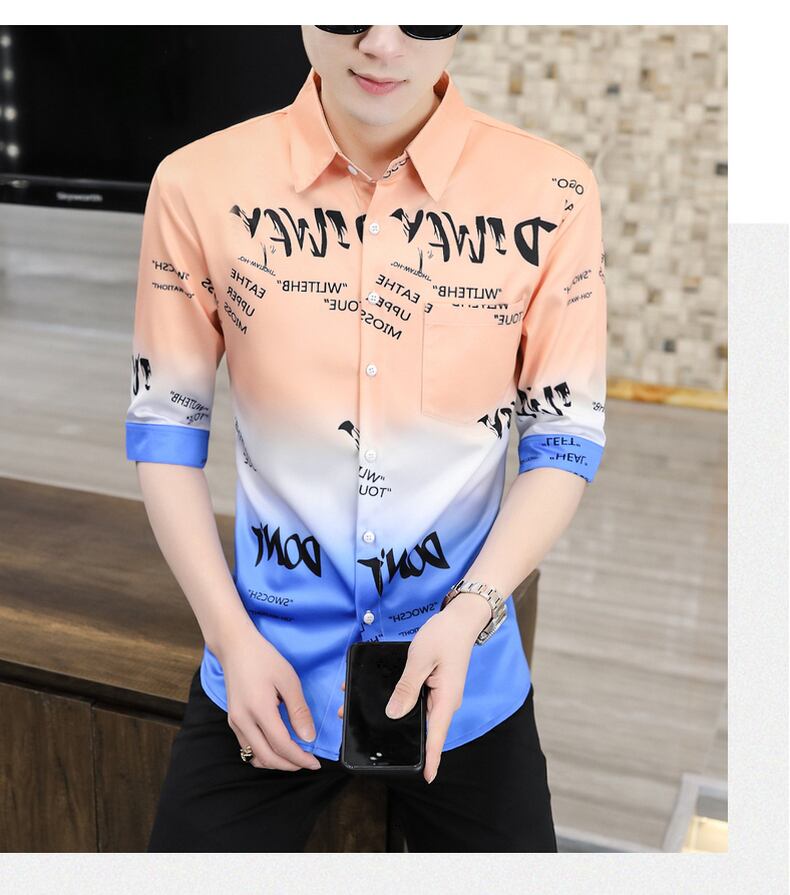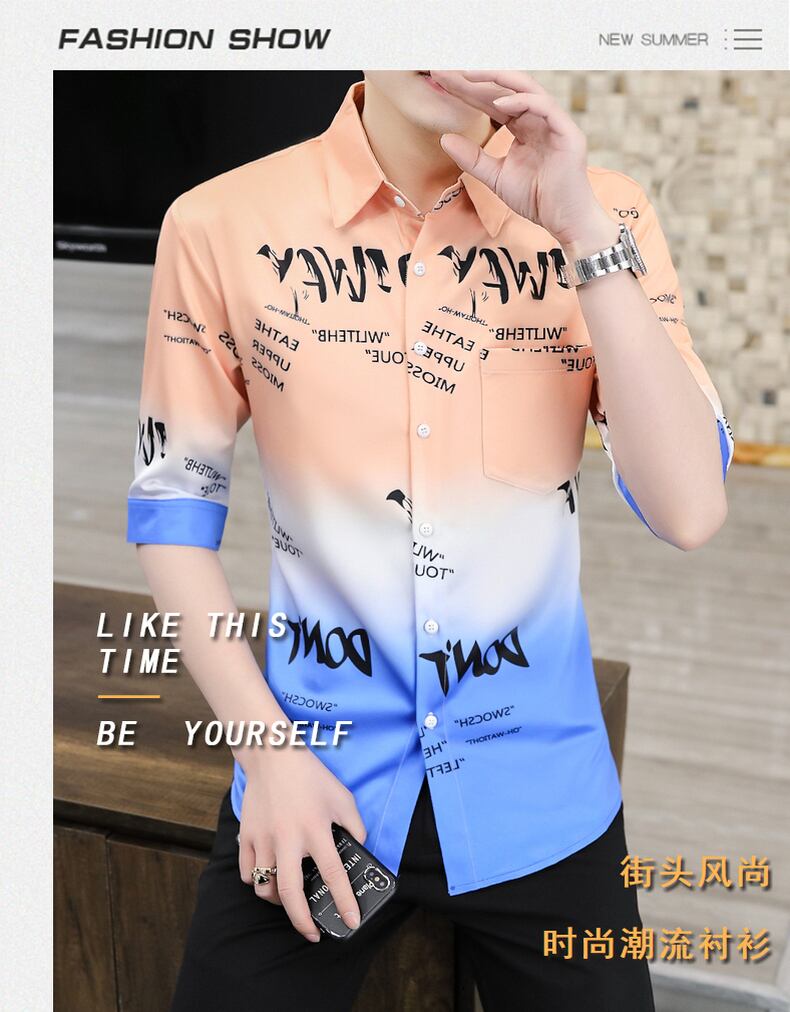 Men's personality tide brand hair stylist men's gradient short-sleeved shirt summer student thin section net red three-quarter sleeve shirt レッド サマー 夏物 doushi77521784028