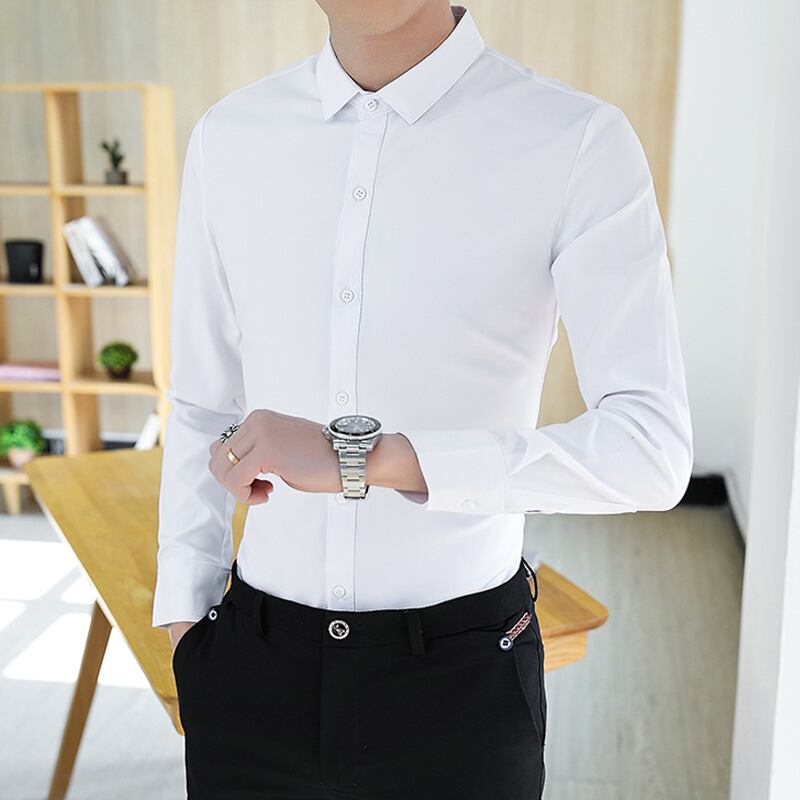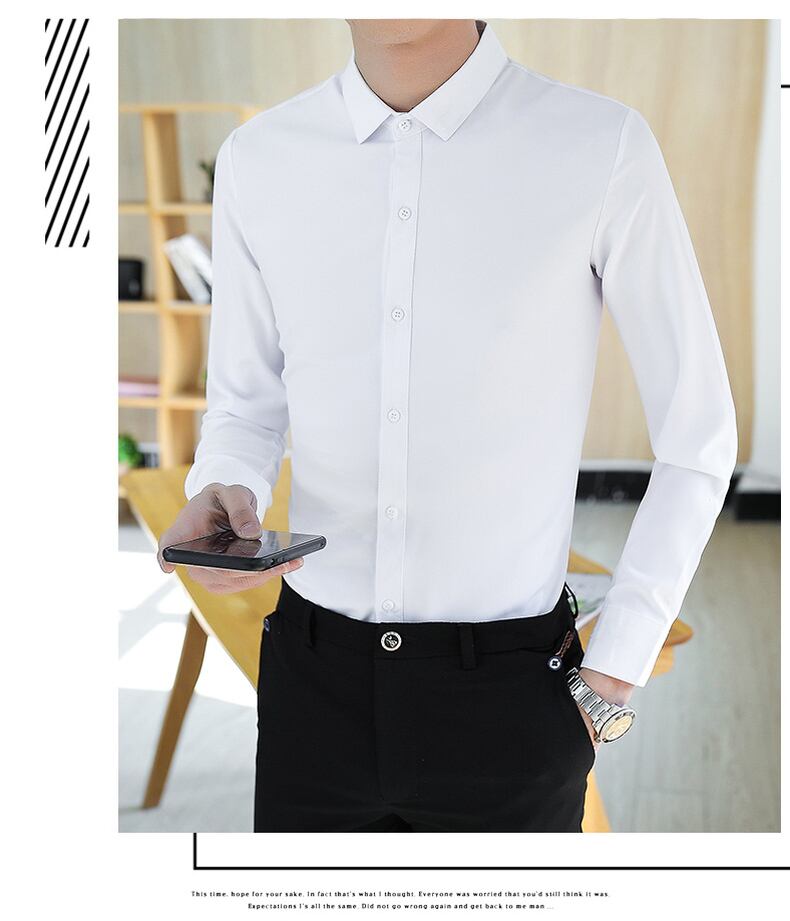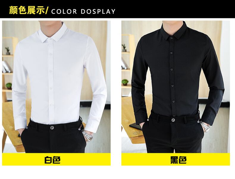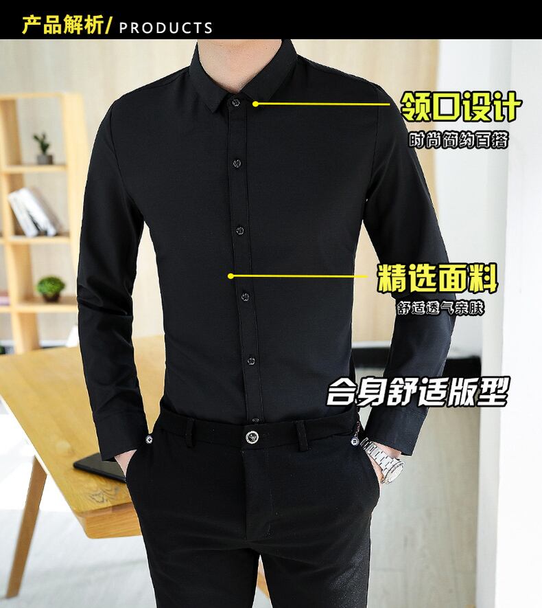 Summer black shirt men's long-sleeved handsome trend casual white shirt men's elastic slim fit iron-free ice silk inch shirt ロング ホワイト ブラック カジュアル エラスティック 伸縮 サマー 夏物 スリム シルク doushi71661698486
