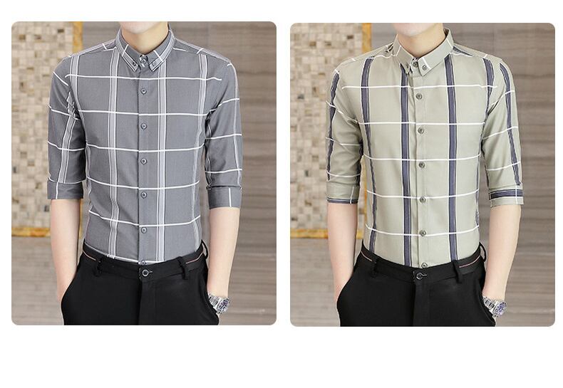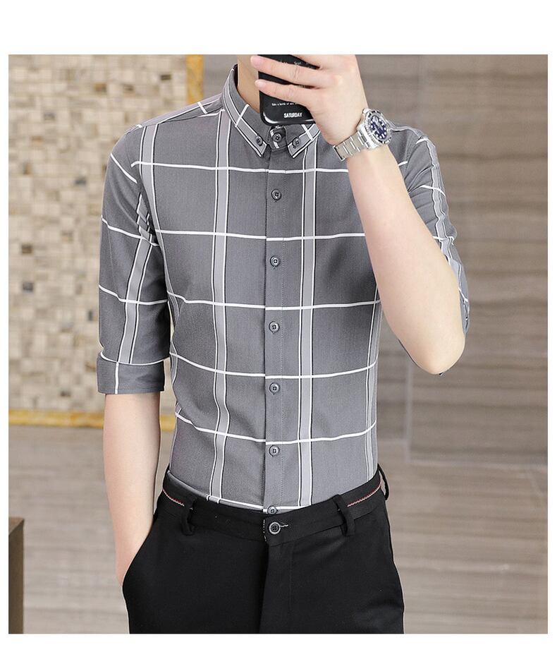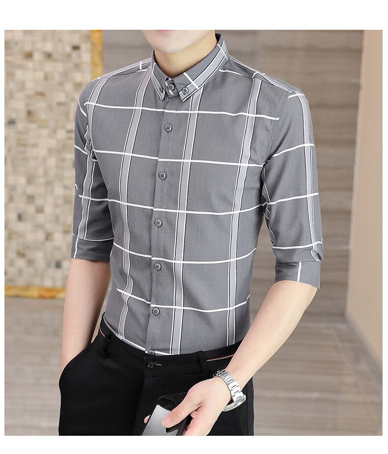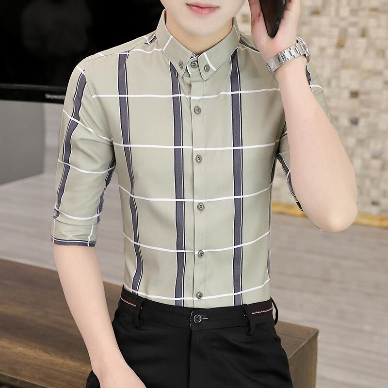 Three-quarter sleeve plaid shirt men's ice silk thin section iron-free high-end sense shirt trendy men's hair stylist short-sleeved summer サマー 夏物 シルク doushi79808111698
