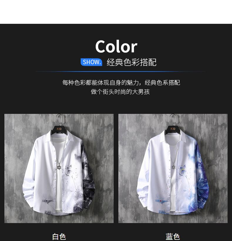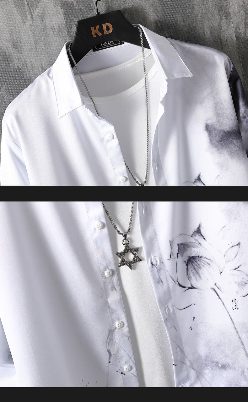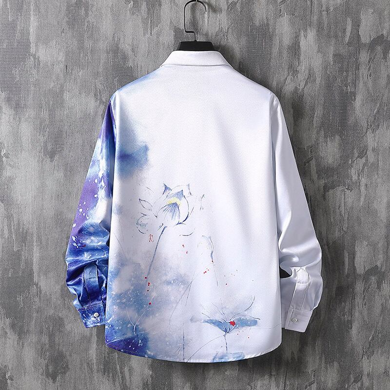 Chinese style men's landscape painting print shirt handsome ink national trendy men's long-sleeved 2022 spring shirt top ロング スプリング 春物 doushi1467428405
