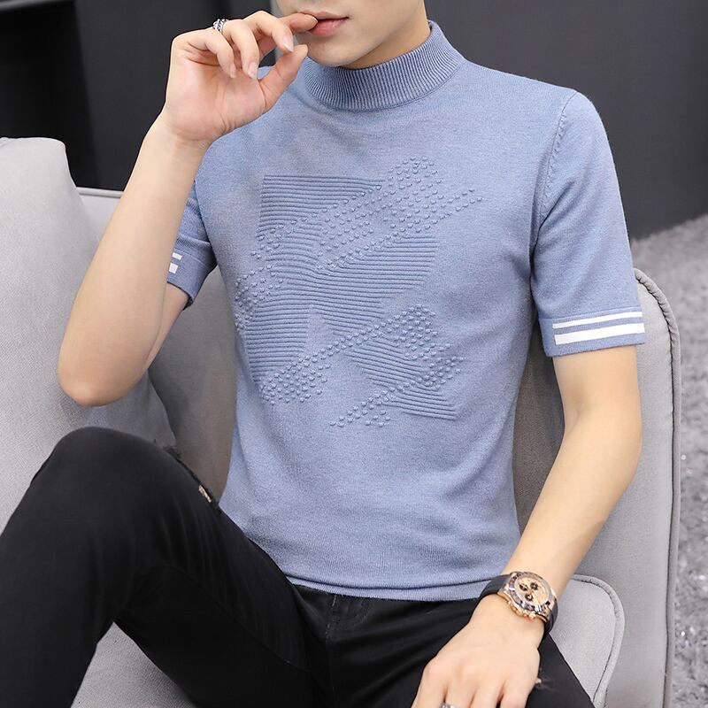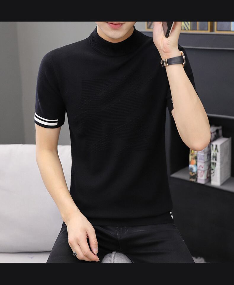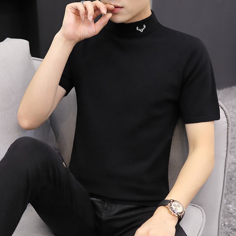 Spring and Autumn Short Sleeve Sweater Trendy Men's Half Turtleneck Bottom Knit Sweater Half Sleeve T-Shirt Youth Middle Collar Top ショート 半袖 ハーフスリーブ スプリング 春物 オータム 秋物 Tシャツ doushi10420427204