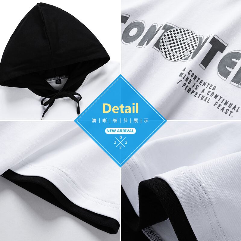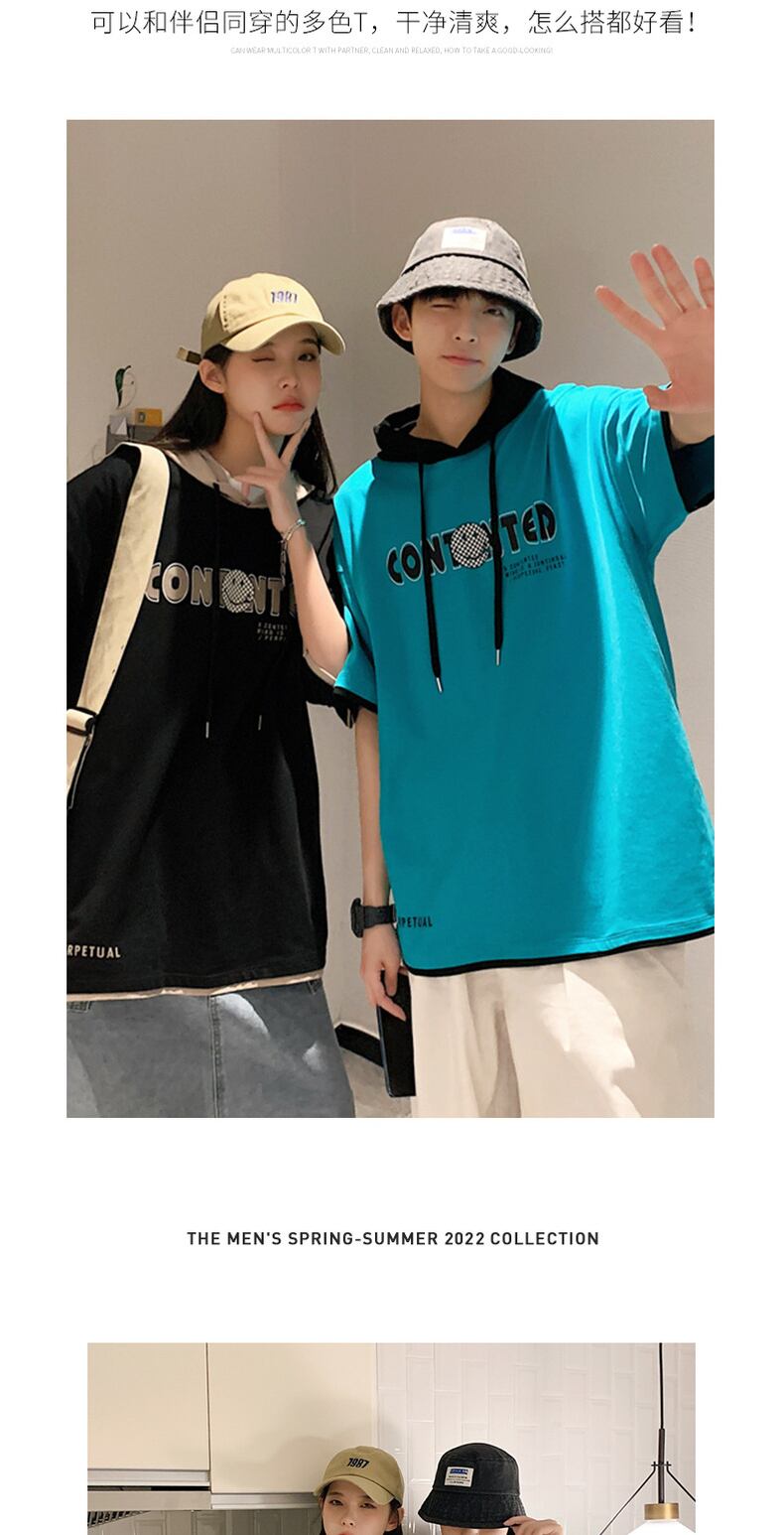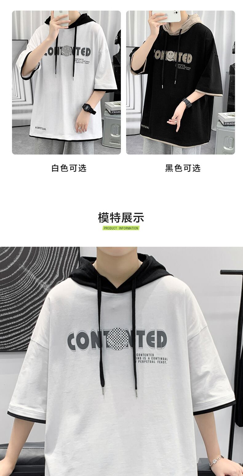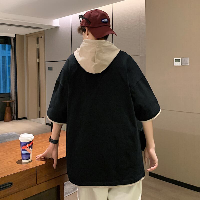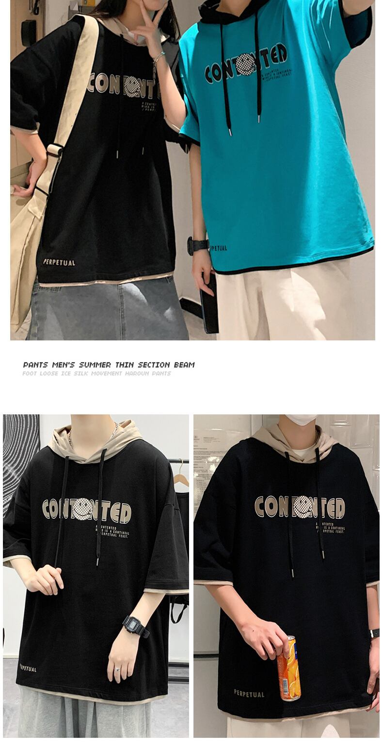 Hooded men's short-sleeved t-shirt summer tide brand Hong Kong style fake two-piece tops no gender 5 five-point half-sleeve t-shirt with hood サマー 夏物 Tシャツ doushi53500646362