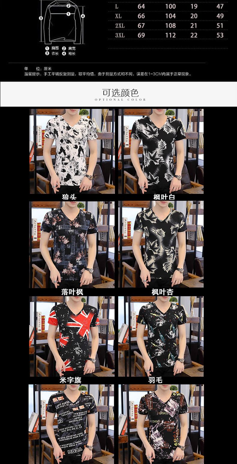Summer new ice silk short-sleeved men's personalized printing color V-neck T-shirt trend social youth breathable t-shirt サマー 夏物 Vネック シルク Tシャツ doushi26807034782