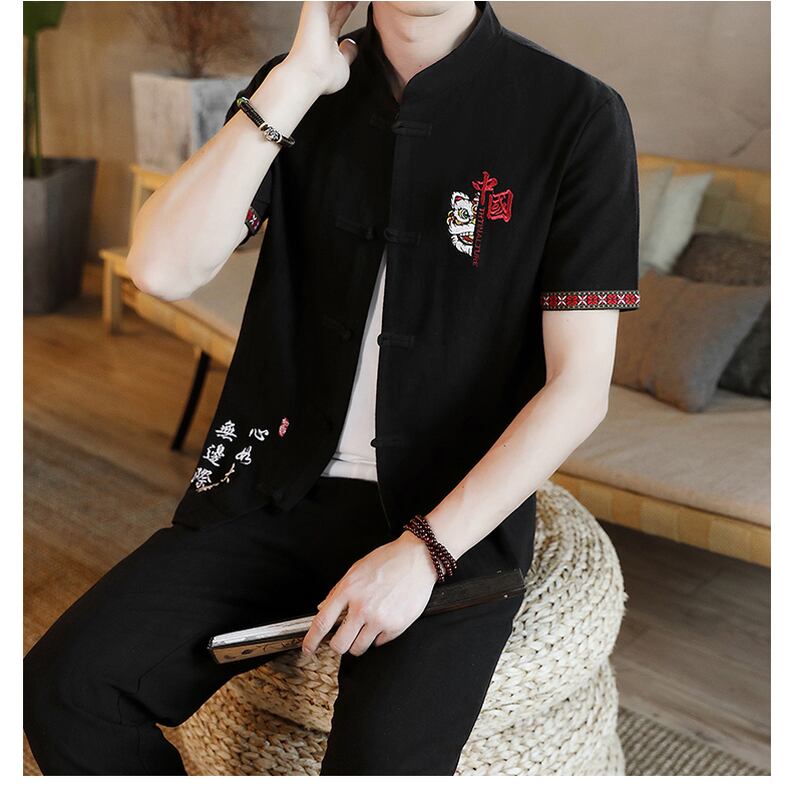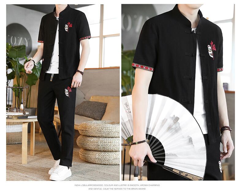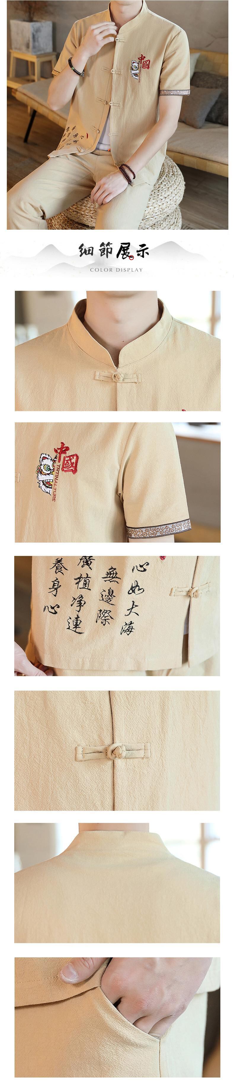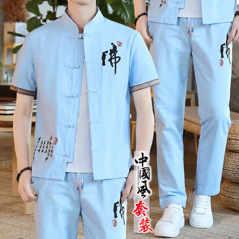 Summer linen suit men's Tang suit casual Chinese style cotton and linen short-sleeved t-shirt 2022 new v Hanfu two-piece suit コットン カジュアル サマー 夏物 Tシャツ doushi77739263439