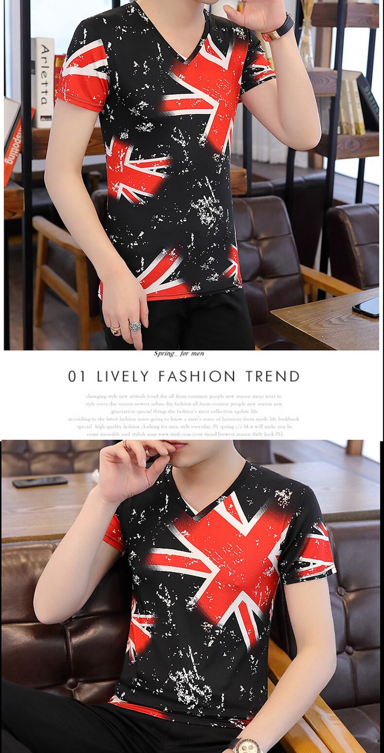 2022 new summer men's ice silk short-sleeved T-shirt version of the trend personality printing handsome v-neck T-shirt top clothes サマー 夏物 Vネック シルク Tシャツ doushi1107516785