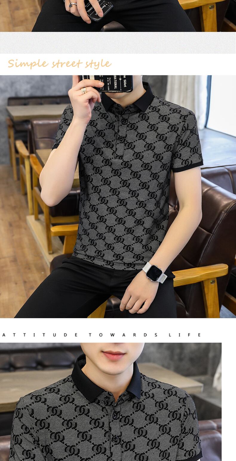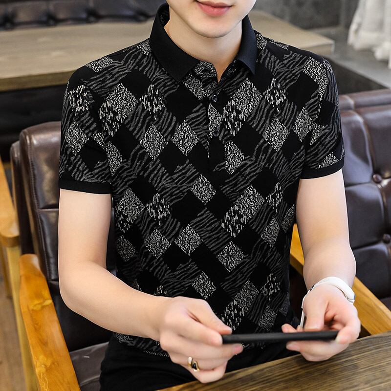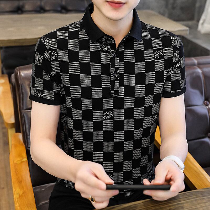 Men's short-sleeved t-shirt tide brand high-end mercerized cotton POLO shirt youth casual thin section plaid ice silk half-sleeve t-shirt コットン カジュアル シルク Tシャツ doushi72776038563