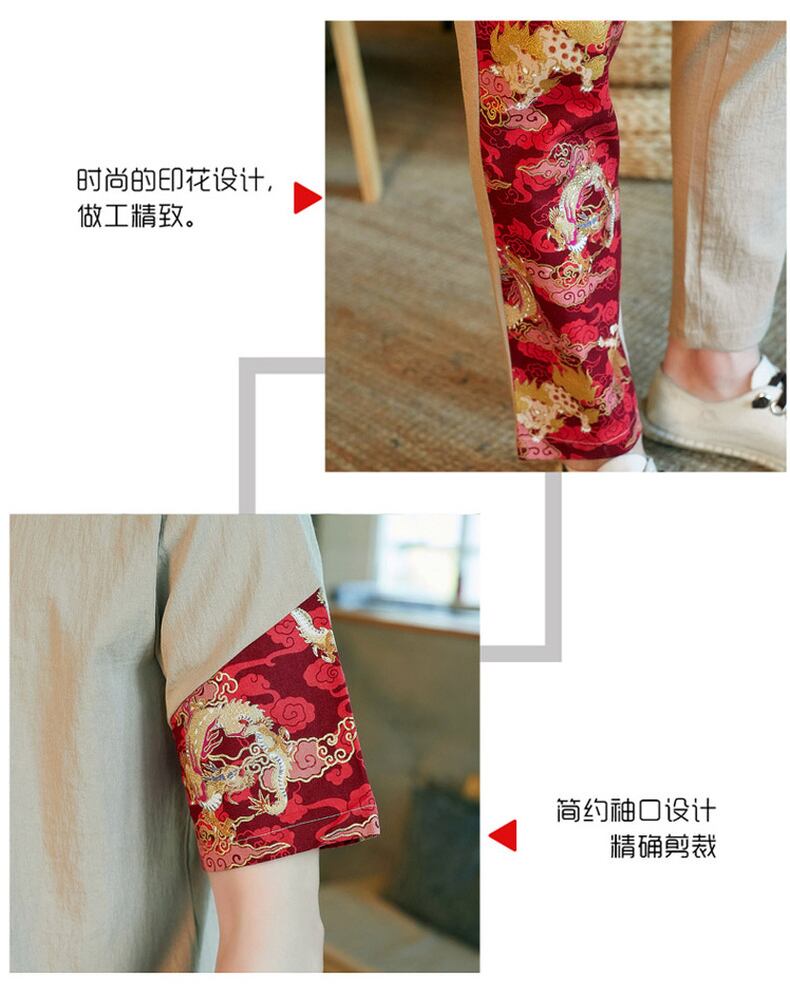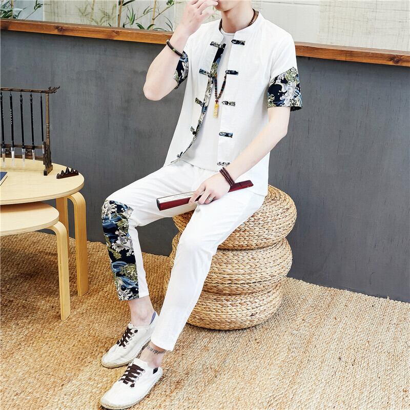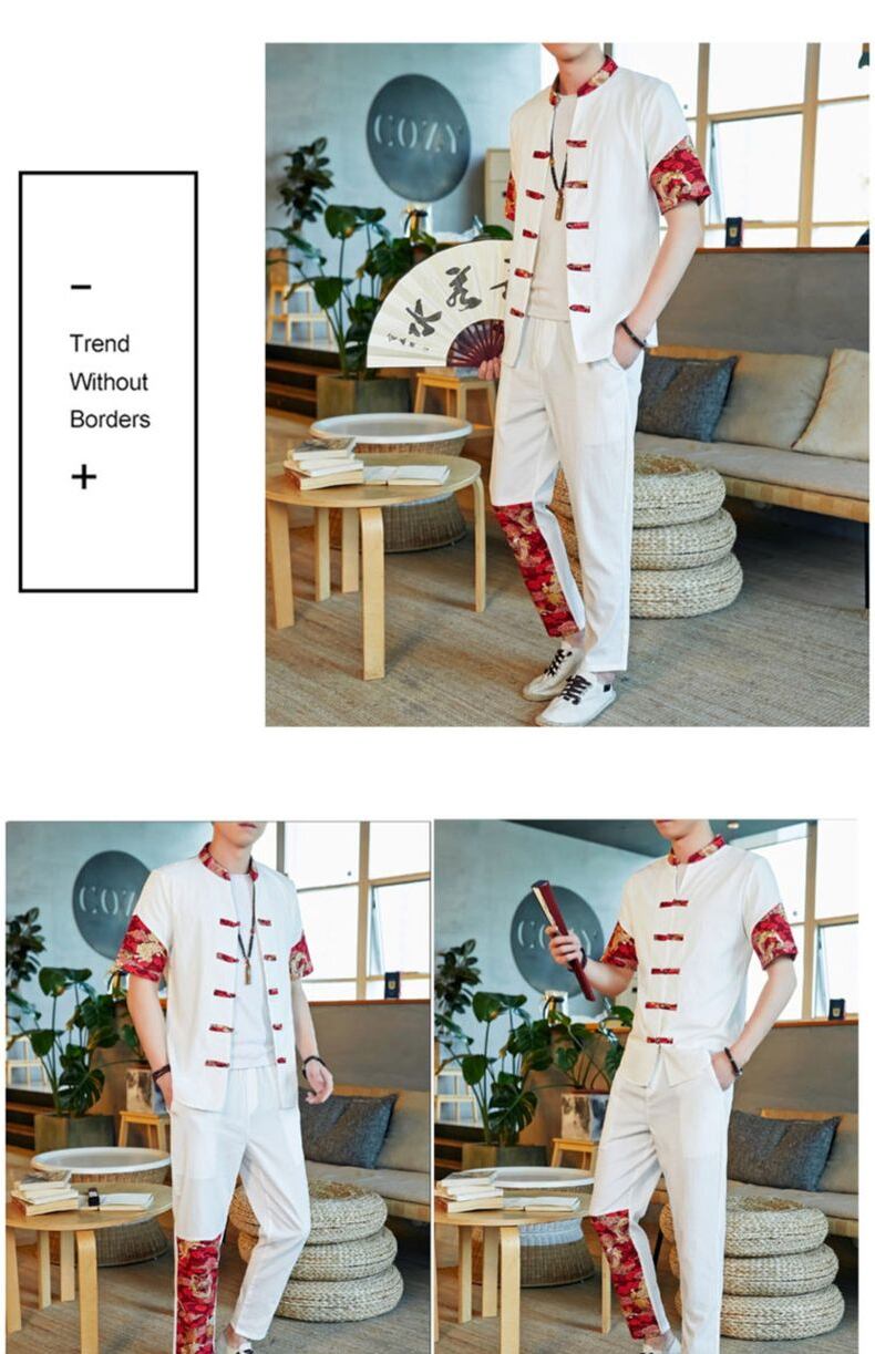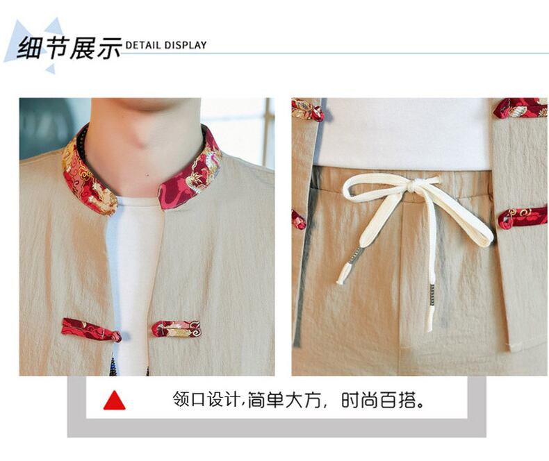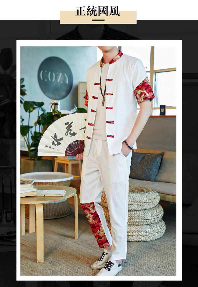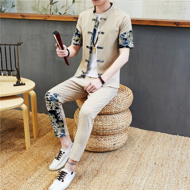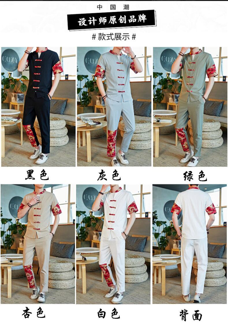 Short-sleeved t-shirt men's linen suit summer Chinese style disc button cardigan stand-up collar Tang suit cotton and linen pants two-piece set コットン カーディガン サマー 夏物 Tシャツ doushi38854284931
