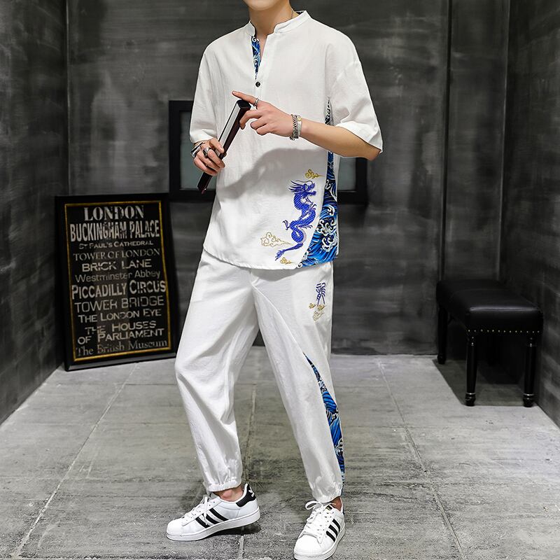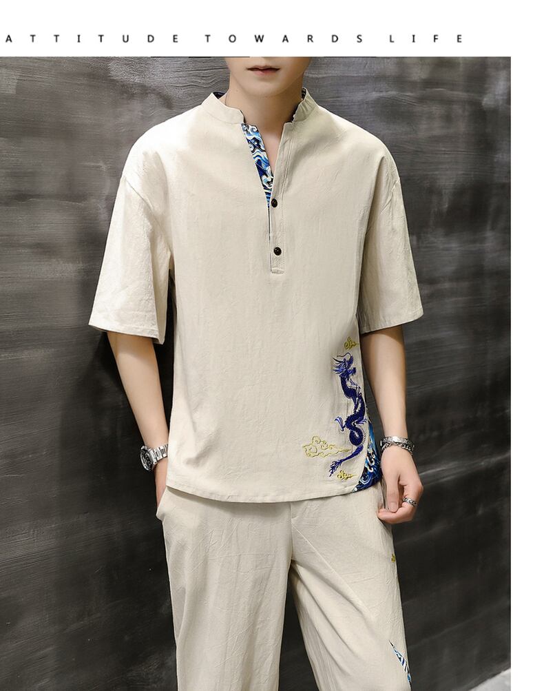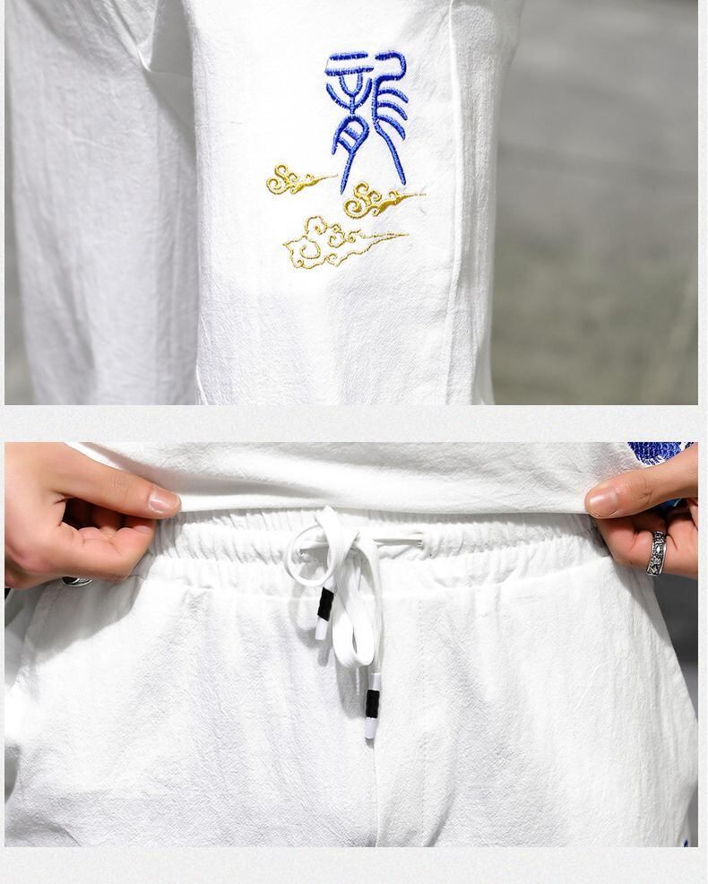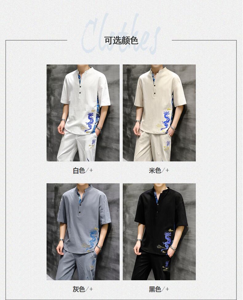 Summer ice silk suit men's Chinese style short-sleeved t-shirt two-piece loose retro printed Tang suit レトロ プリント サマー 夏物 シルク Tシャツ doushi22880535866