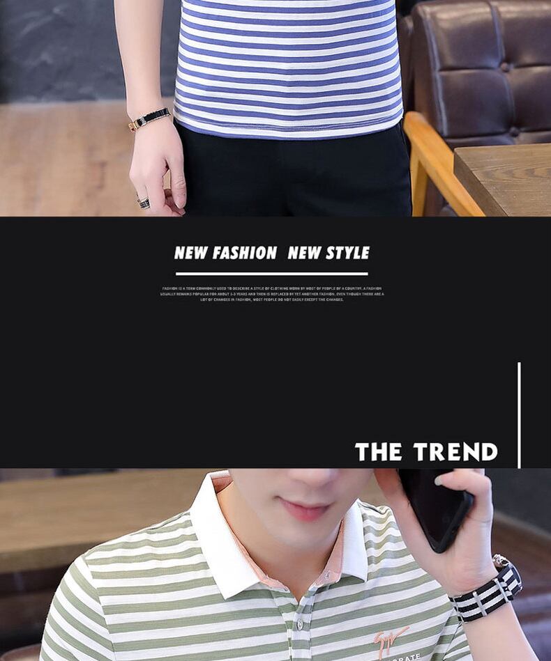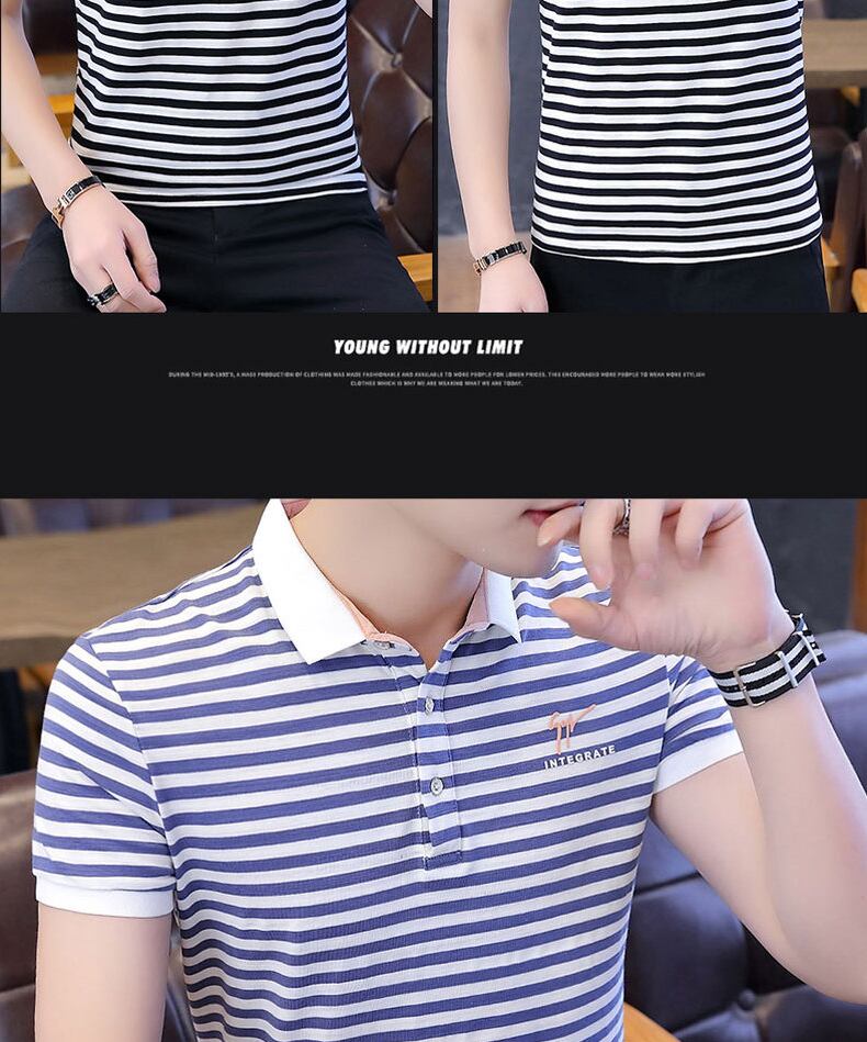 Short-sleeved t-shirt men's summer small lapel top men's cotton striped clothes polo shirt body half-sleeved polo shirt コットン サマー 夏物 ストライプ Tシャツ doushi73226763003