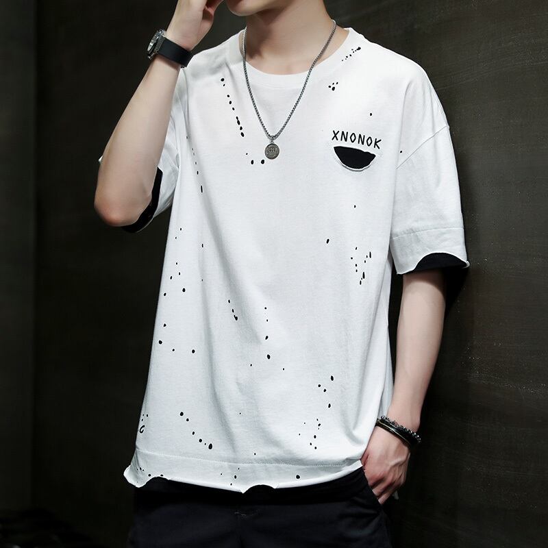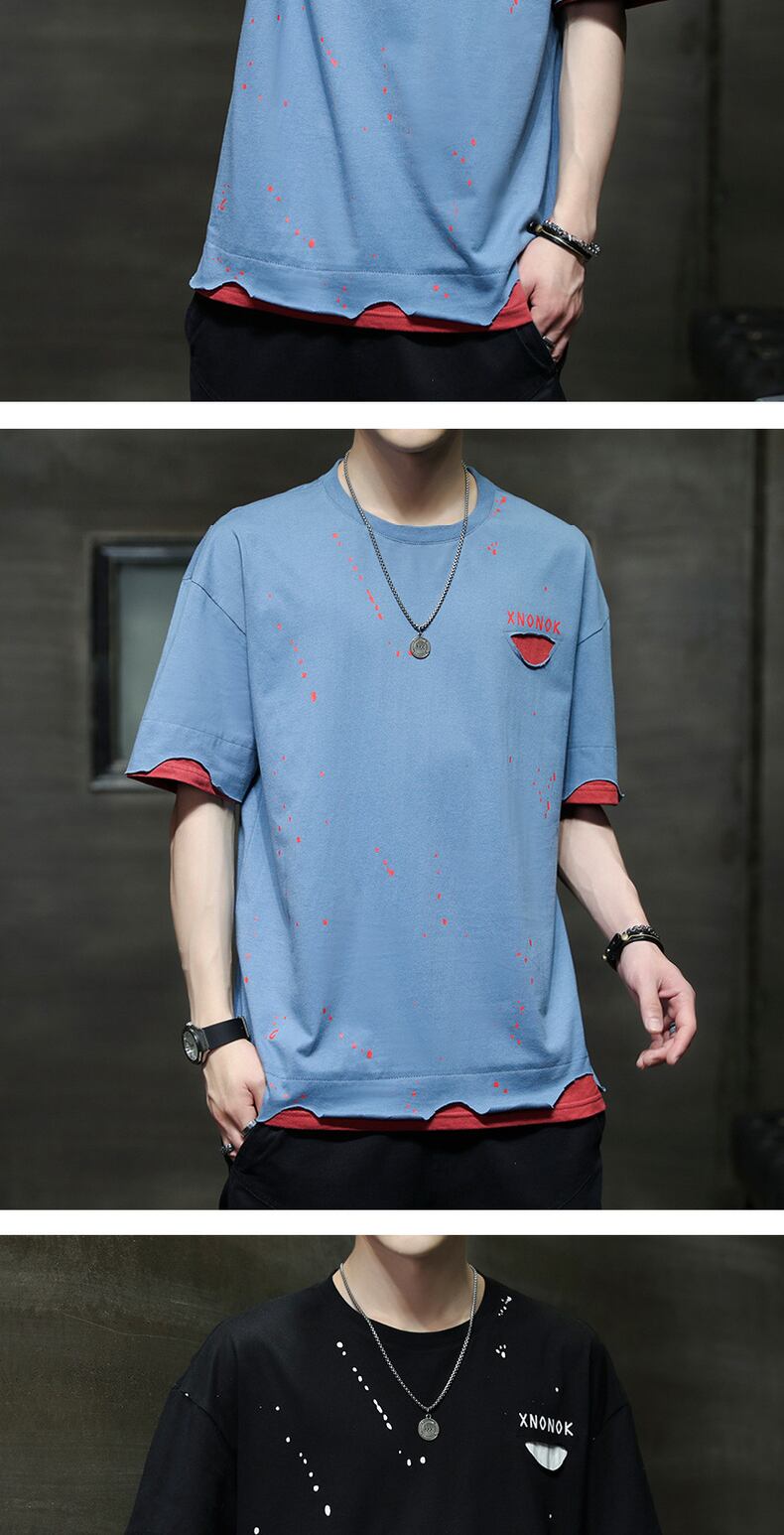 Tide brand 2022 summer new short-sleeved T-shirt men's trend all-match loose cotton hole beggar half-sleeved clothes コットン サマー 夏物 Tシャツ doushi49844855691