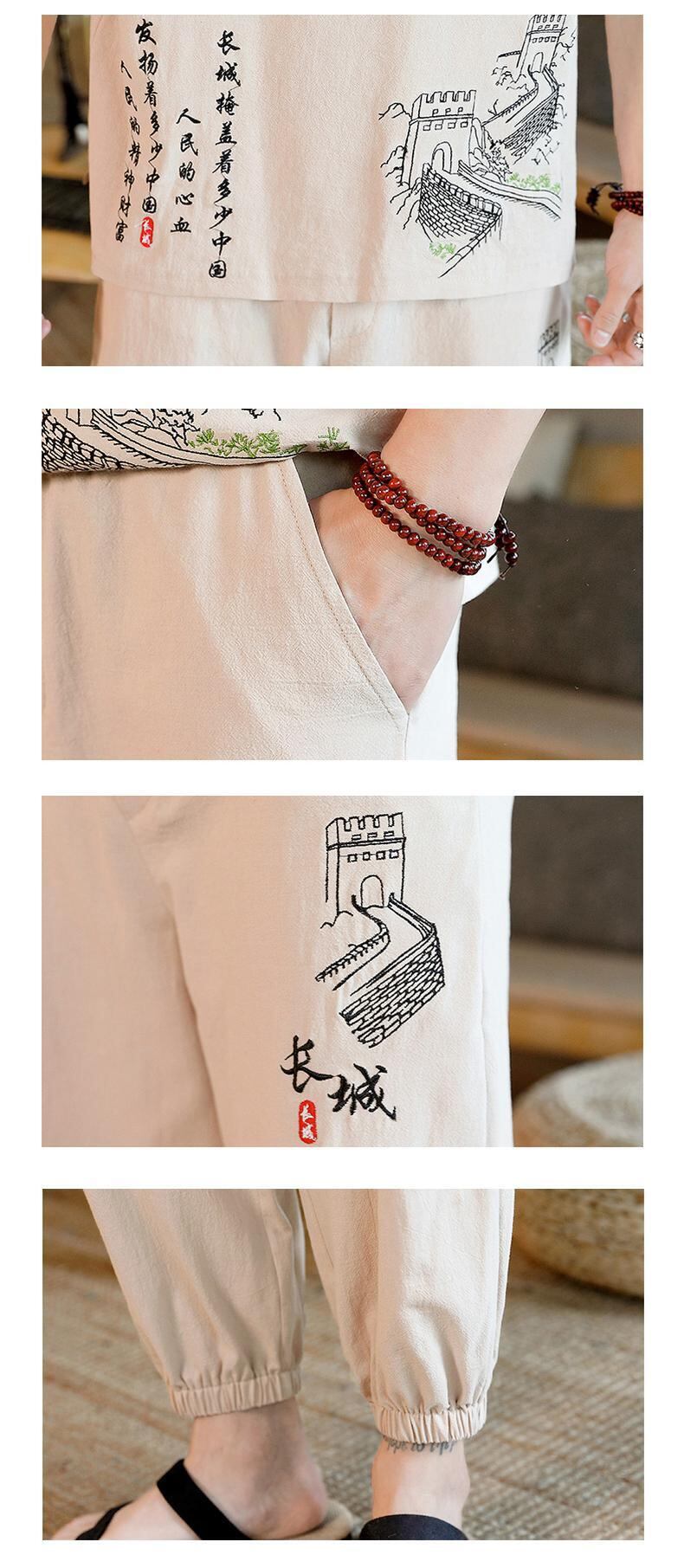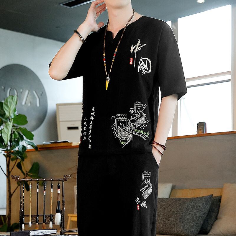 Chinese style summer suit men's loose casual cotton and linen Hanfu retro men's short-sleeved t-shirt two-piece Tang suit コットン レトロ カジュアル サマー 夏物 Tシャツ doushi89018771389