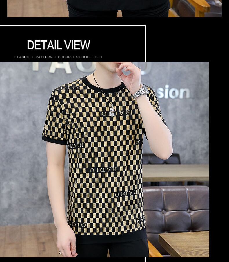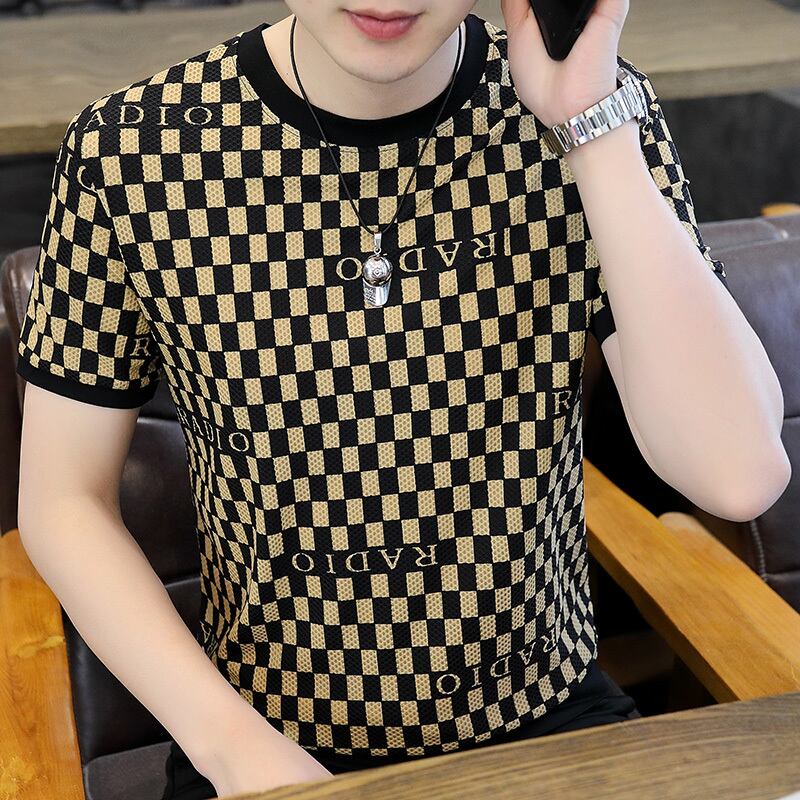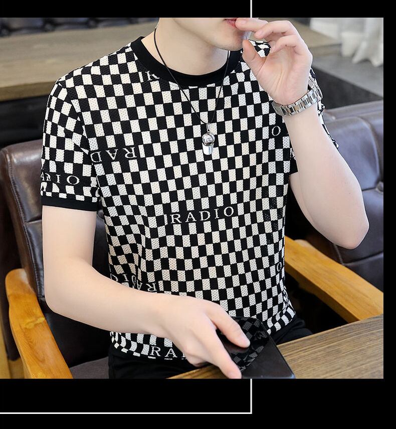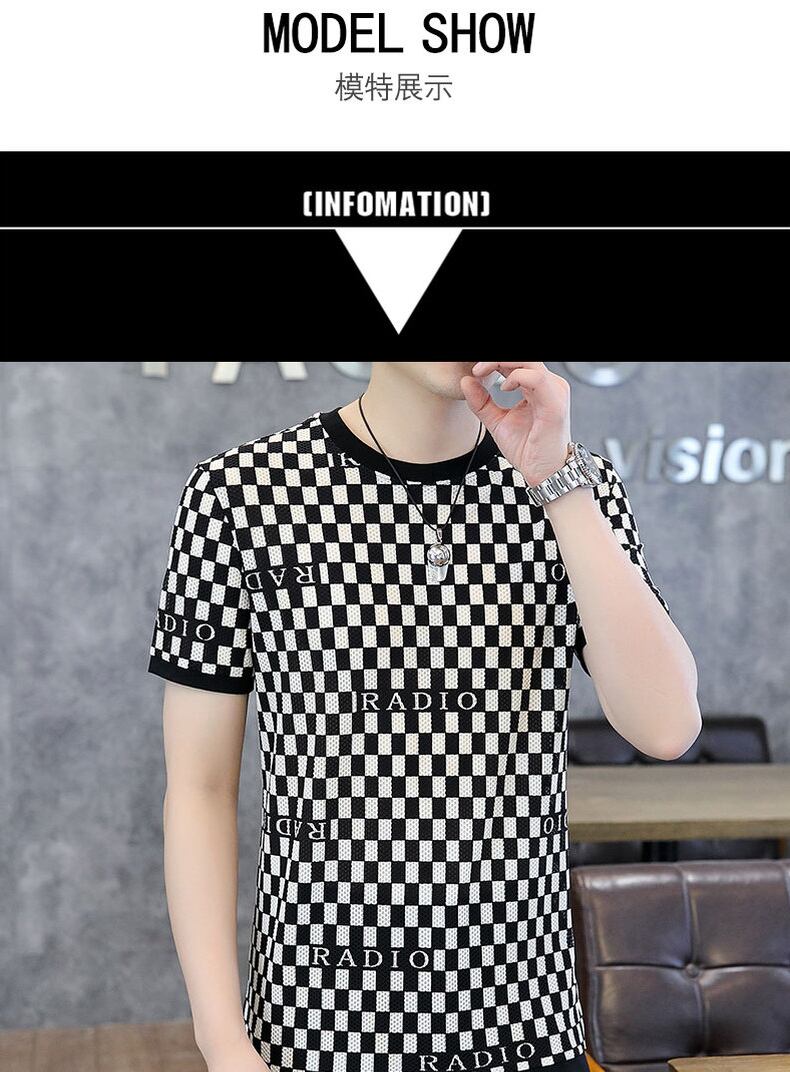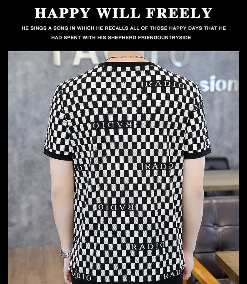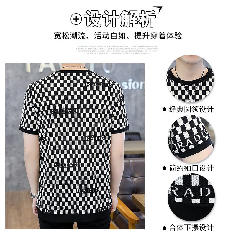 Ice silk short-sleeved t-shirt men's summer trend black and white plaid thin half-sleeved tide brand hollow breathable sports clothes ホワイト ブラック サマー 夏物 シルク Tシャツ doushi62708066107