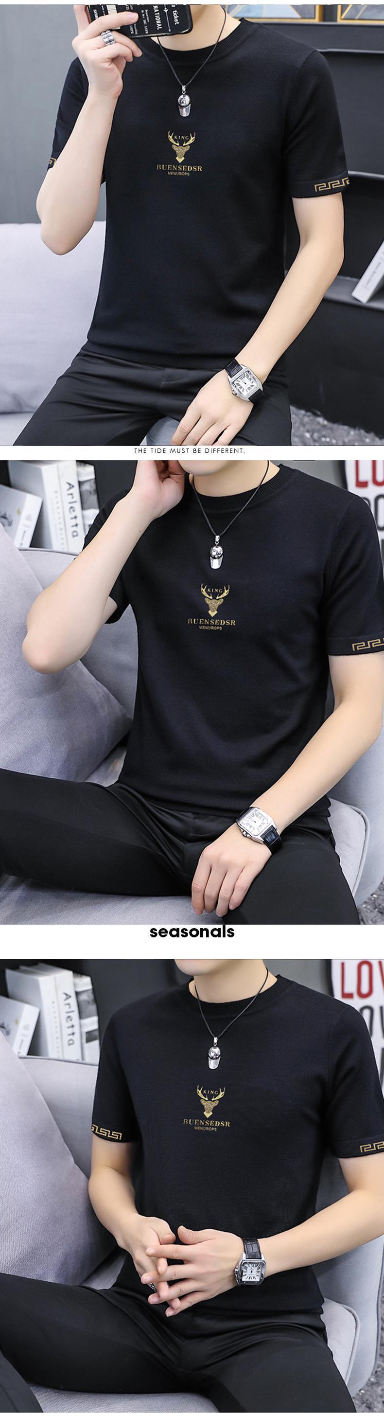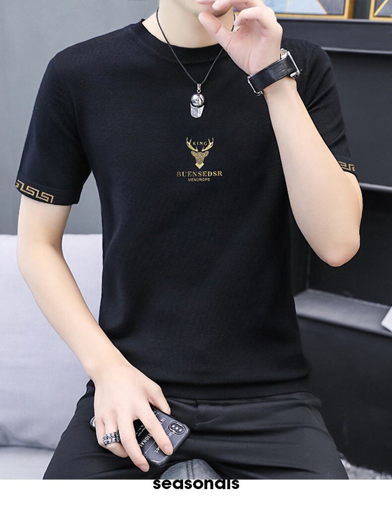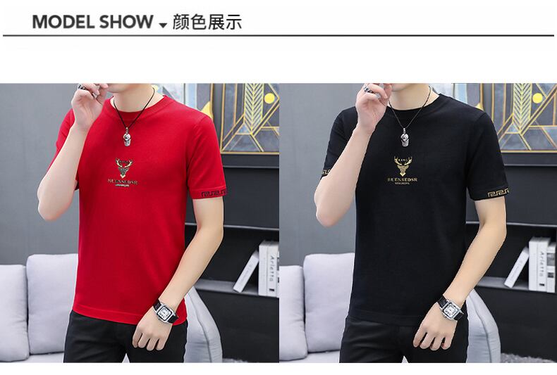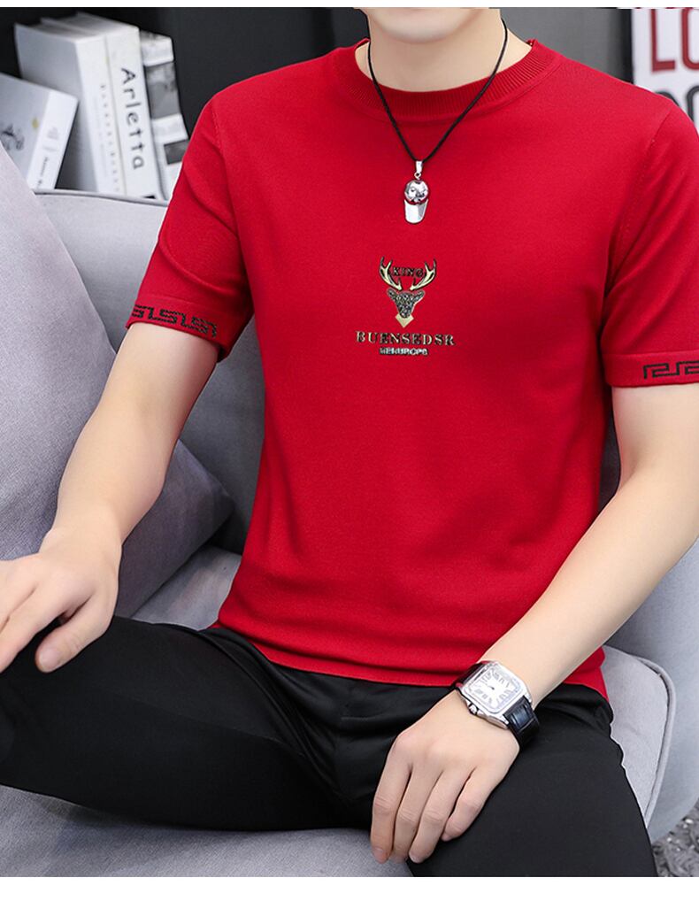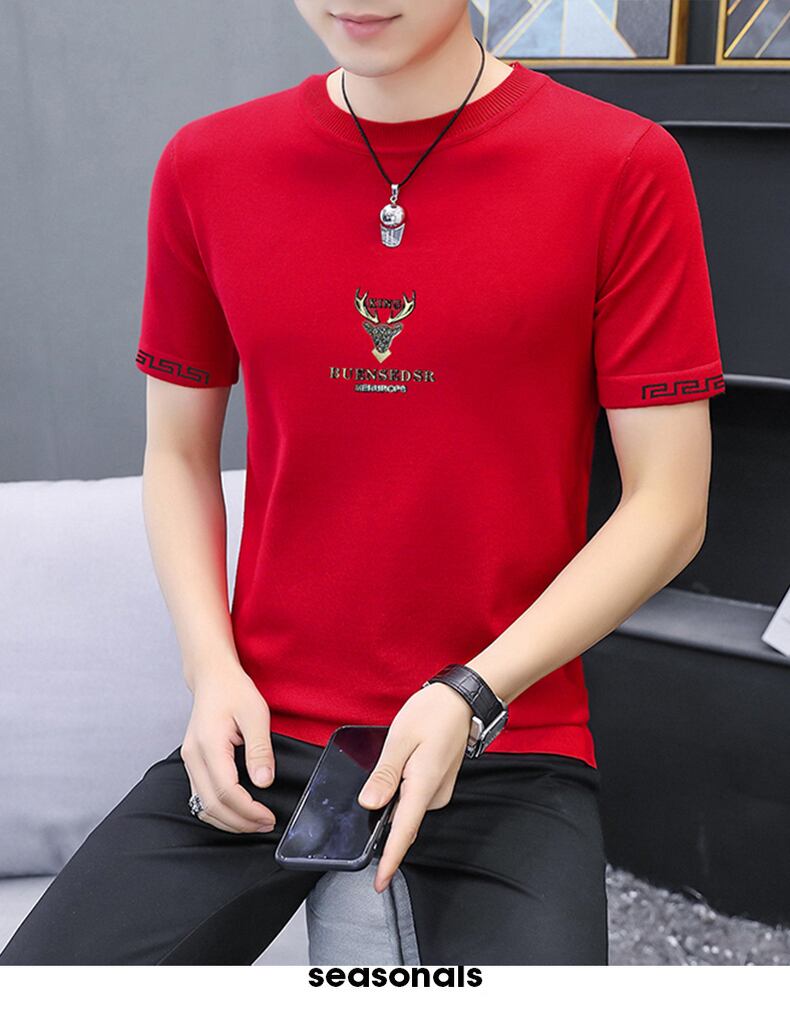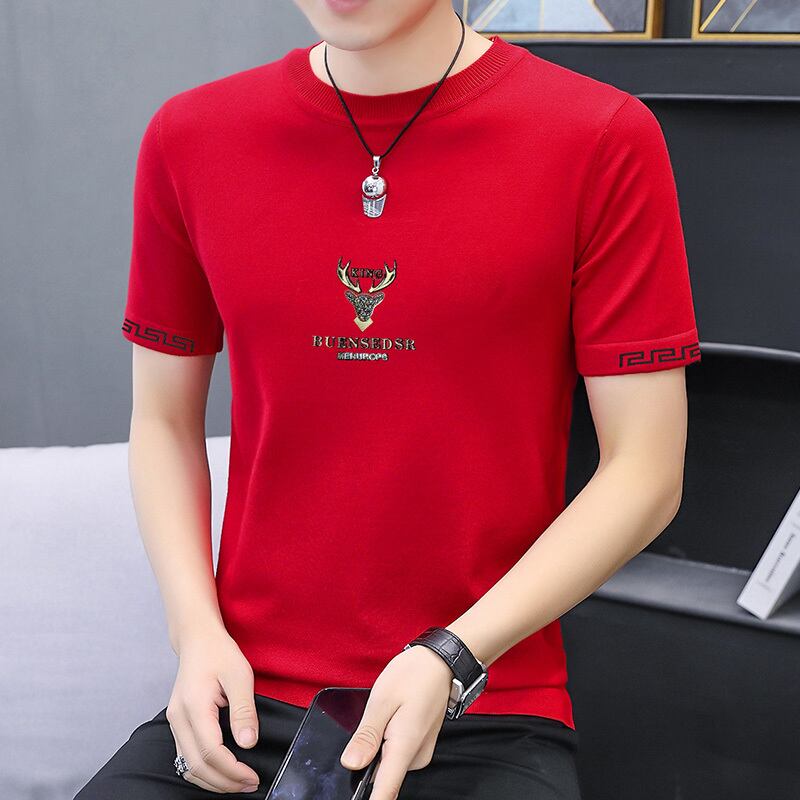 2022 summer new knitted ice silk short-sleeved natal red T-shirt men's slim top bottoming shirt T-shirt レッド サマー 夏物 スリム シルク Tシャツ doushi97651623278