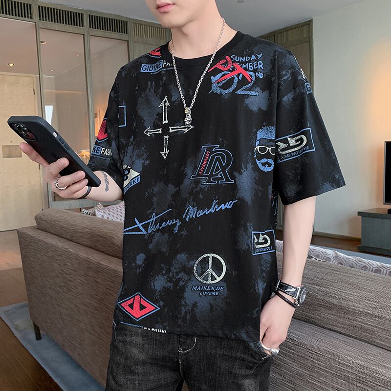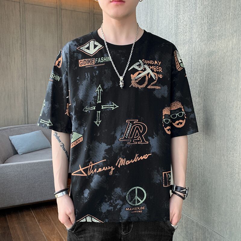 Cotton T-shirt Men's Personality Trend Printing Round Neck Half Sleeve Top Clothes Loose Summer Short Sleeve T-Shirt ショート コットン 半袖 ハーフスリーブ サマー 夏物 Oネック Tシャツ doushi99287634018
