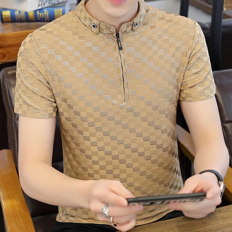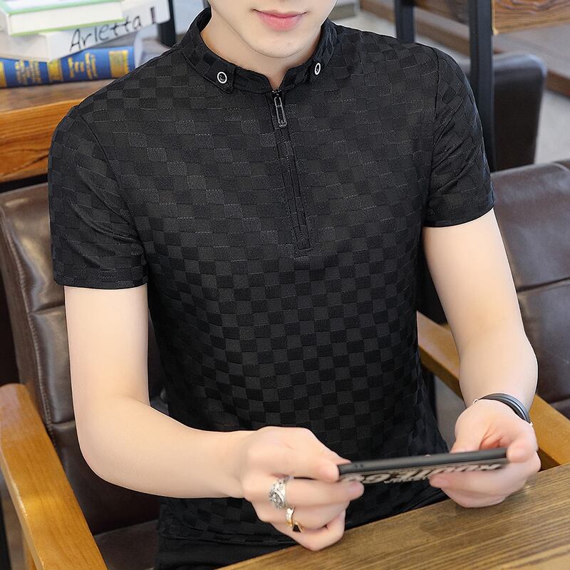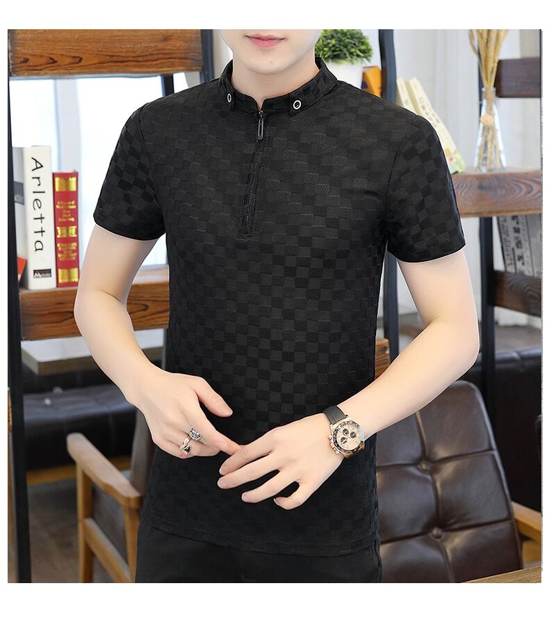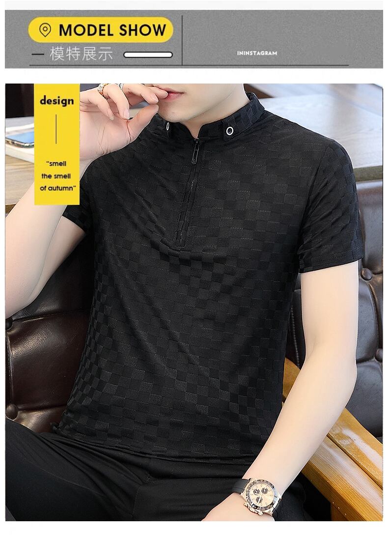 Thin t-shirt men's slim ice silk plaid polo shirt summer zipper neckline top with collar short-sleeved t-shirt サマー 夏物 スリム シルク Tシャツ doushi79360529015