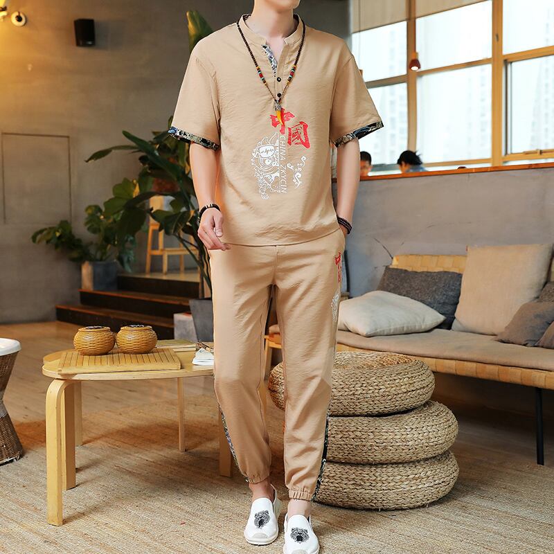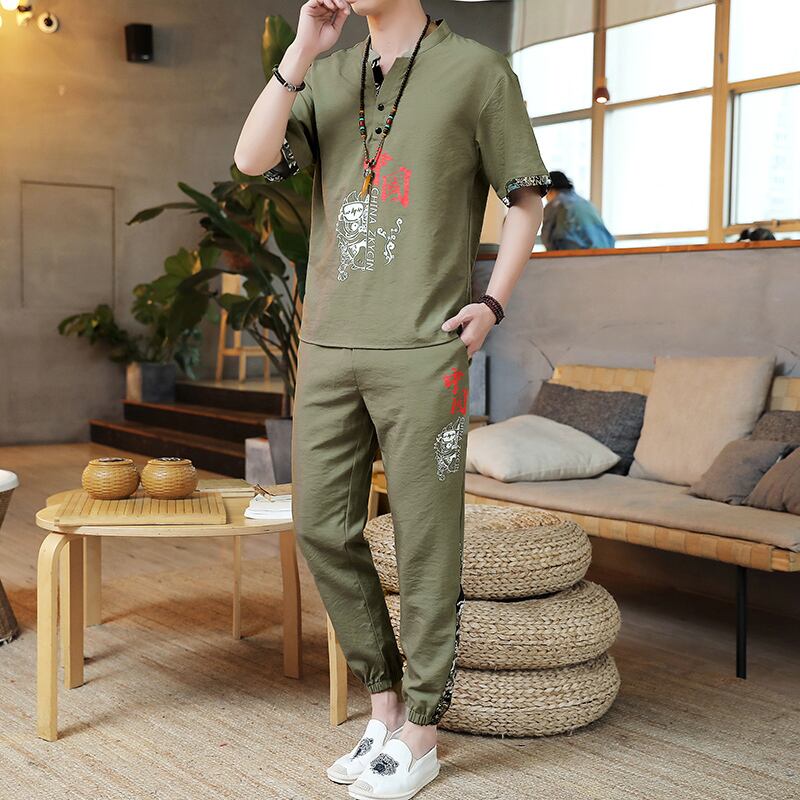 Chinese style men's clothing 2022 new summer ice silk short-sleeved t-shirt suit Tang suit Guochao Buddhist Hanfu men's set サマー 夏物 シルク Tシャツ doushi81952970907
