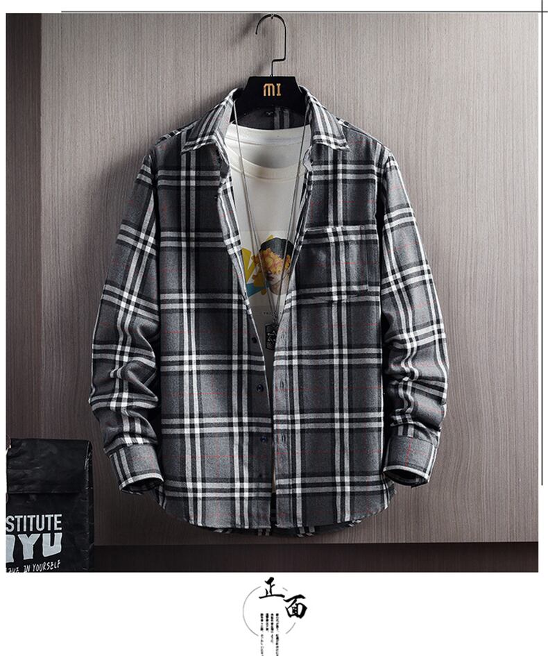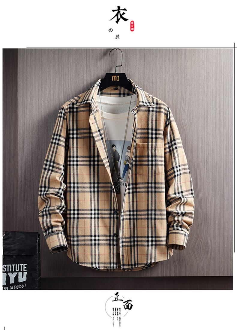 Plaid shirt men's tide brand Hong Kong style spring and summer new loose all-match long-sleeved net red khaki plaid shirt jacket ロング レッド スプリング 春物 サマー 夏物 doushi29508077489