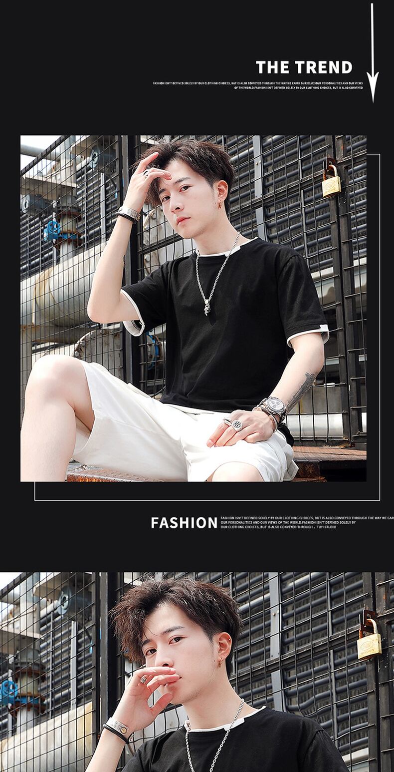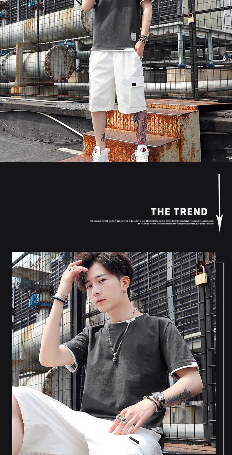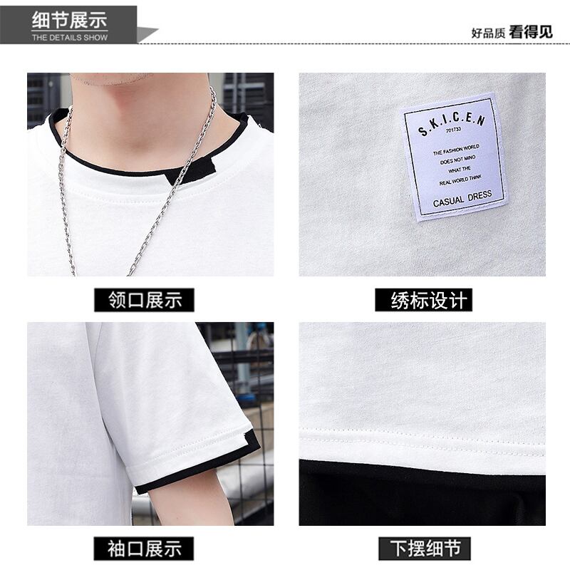 Fake two-piece short-sleeved t-shirt men's summer trend ins blue cotton round neck half-sleeved tide brand breathable sports clothes ブルー コットン サマー 夏物 Oネック Tシャツ doushi34332803704