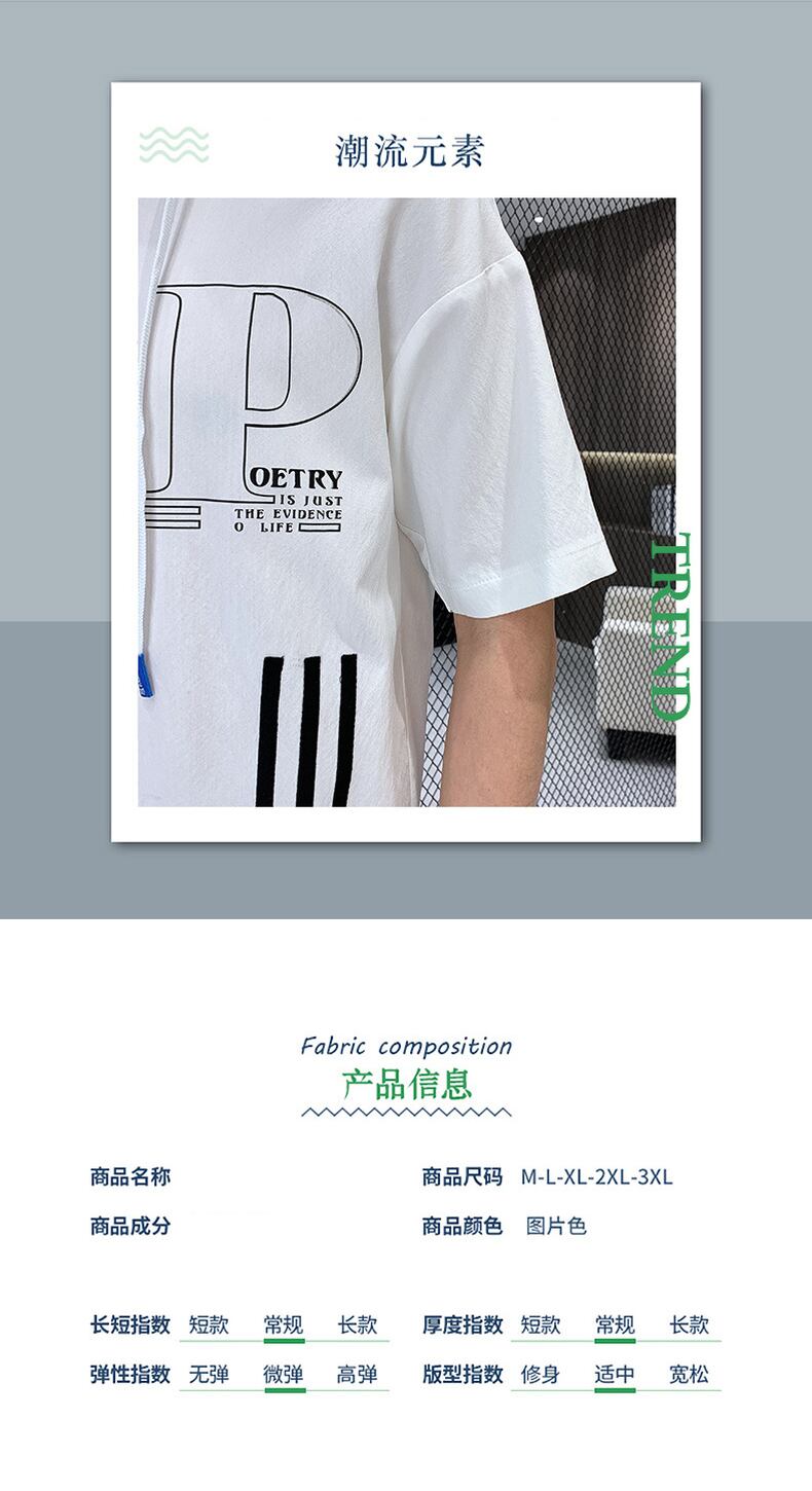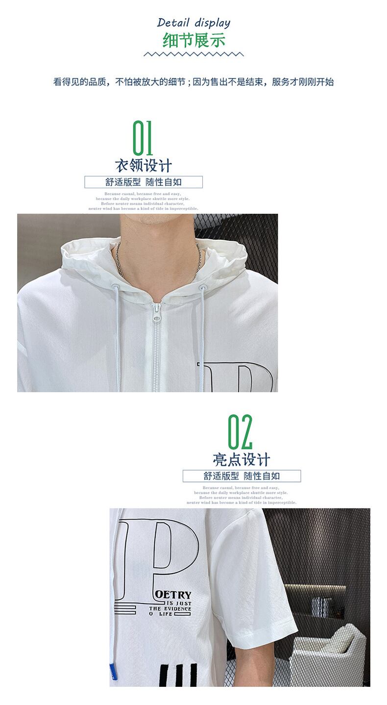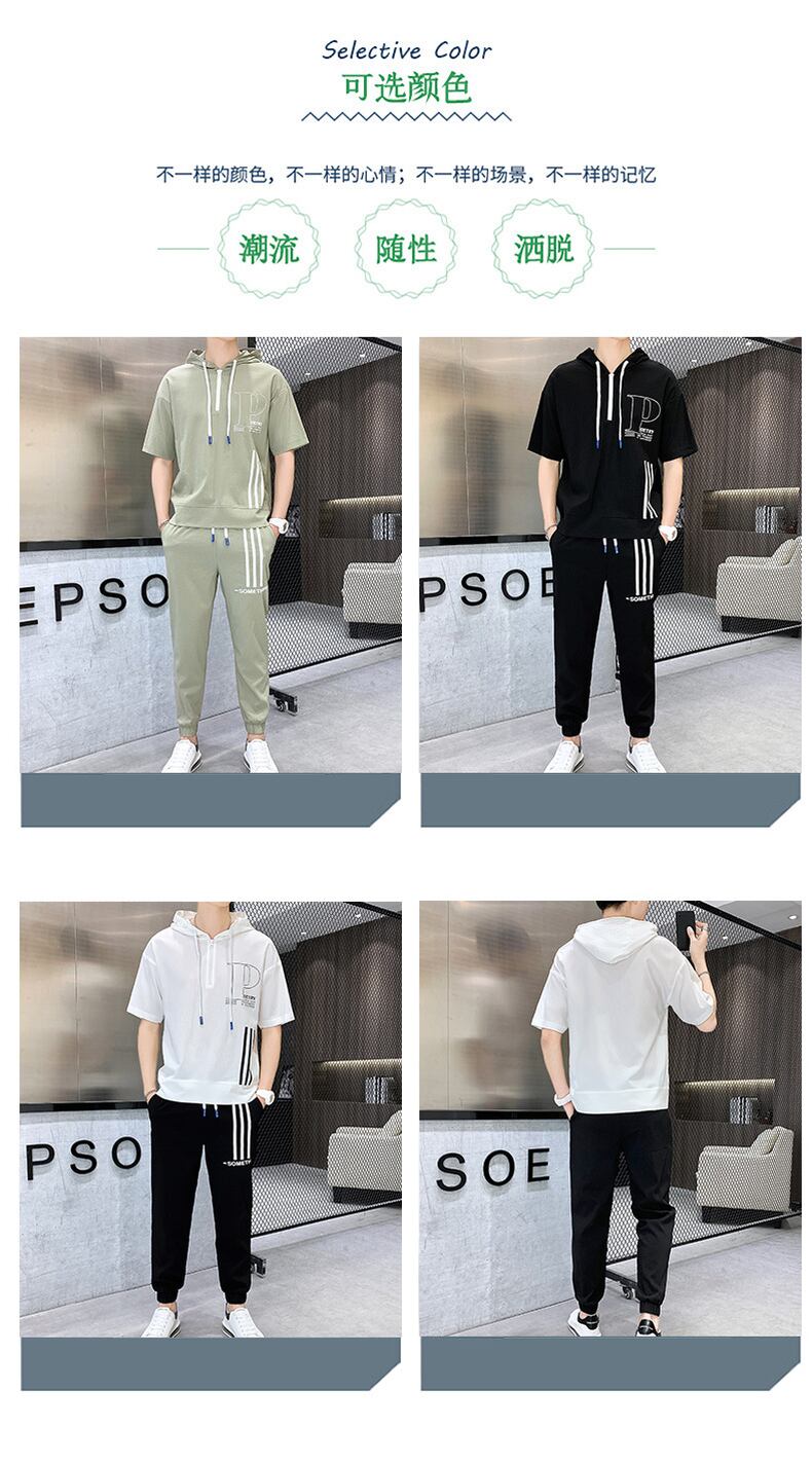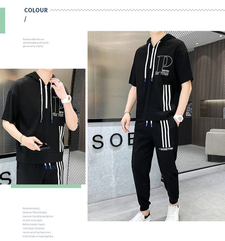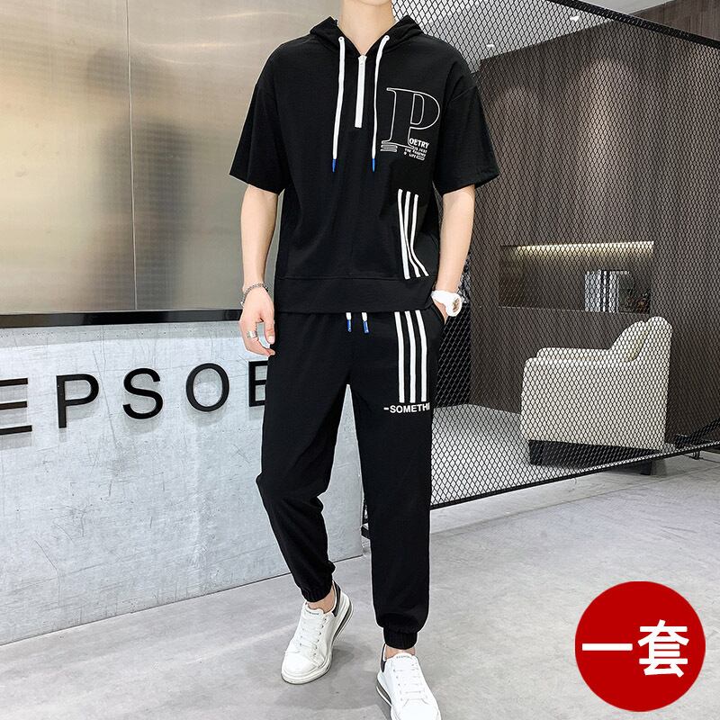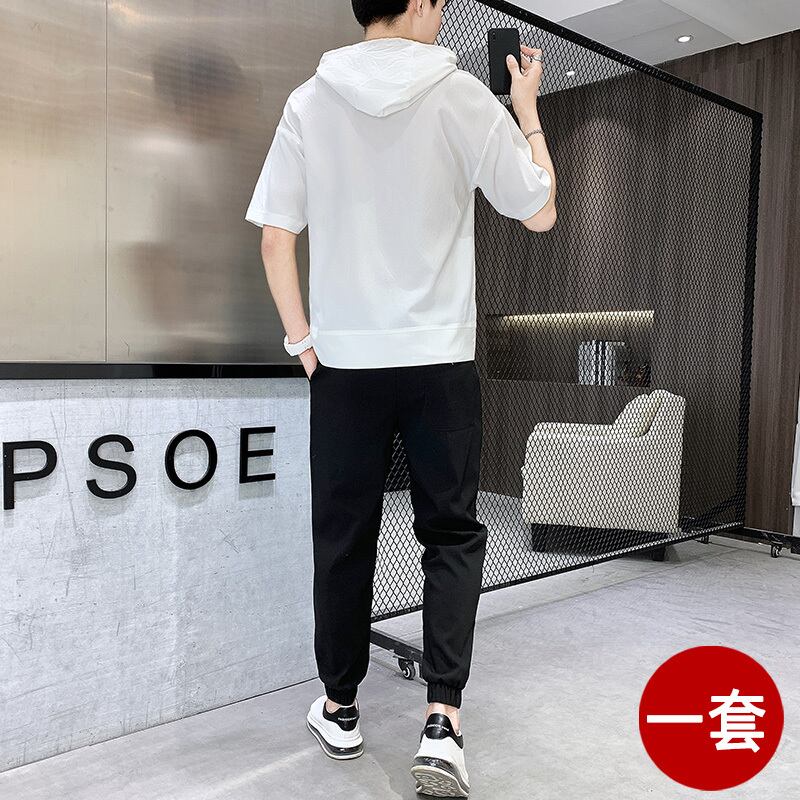 Short-sleeved suit men's ice silk summer thin hooded t-shirt nine-point pants set men's casual sports clothes trend カジュアル サマー 夏物 シルク Tシャツ doushi99232026396