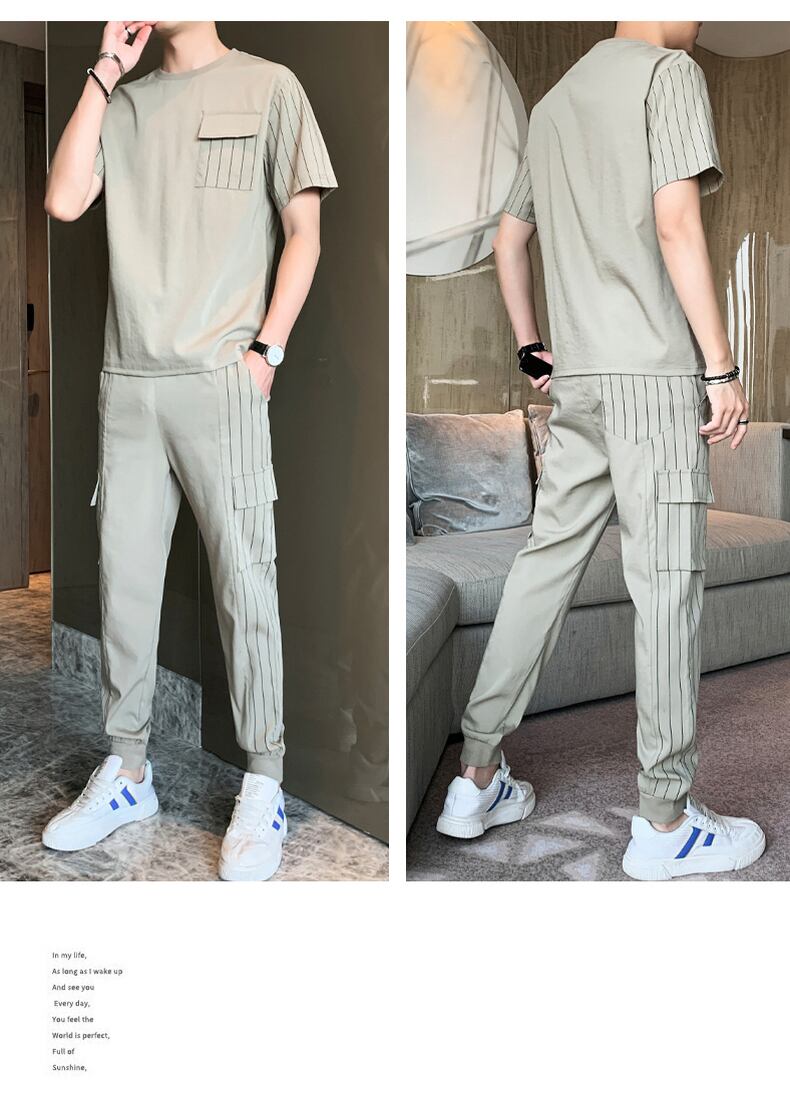 Ice silk striped short-sleeved T-shirt men's suit summer youth handsome version trend casual sports trousers suit カジュアル サマー 夏物 ストライプ シルク Tシャツ doushi14348105985