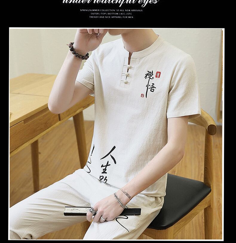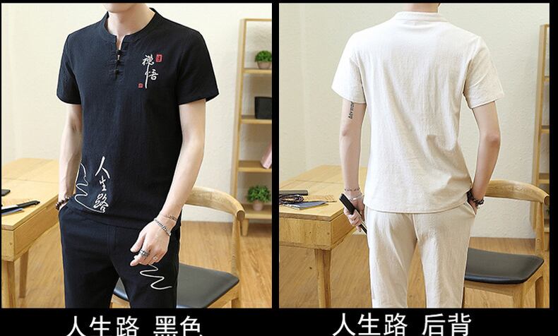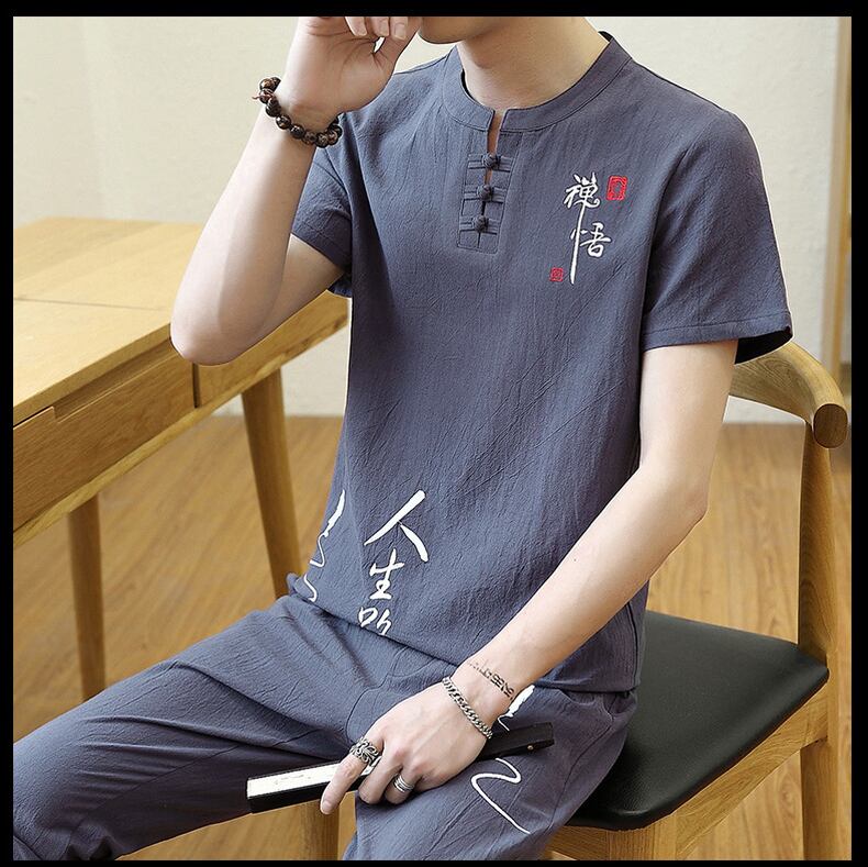 Summer Chinese style linen suit men's Hanfu cotton and linen short-sleeved t-shirt Tang costume ancient costume v Chinese style embroidery two-piece set コットン 刺繍 サマー 夏物 Tシャツ doushi66608993628