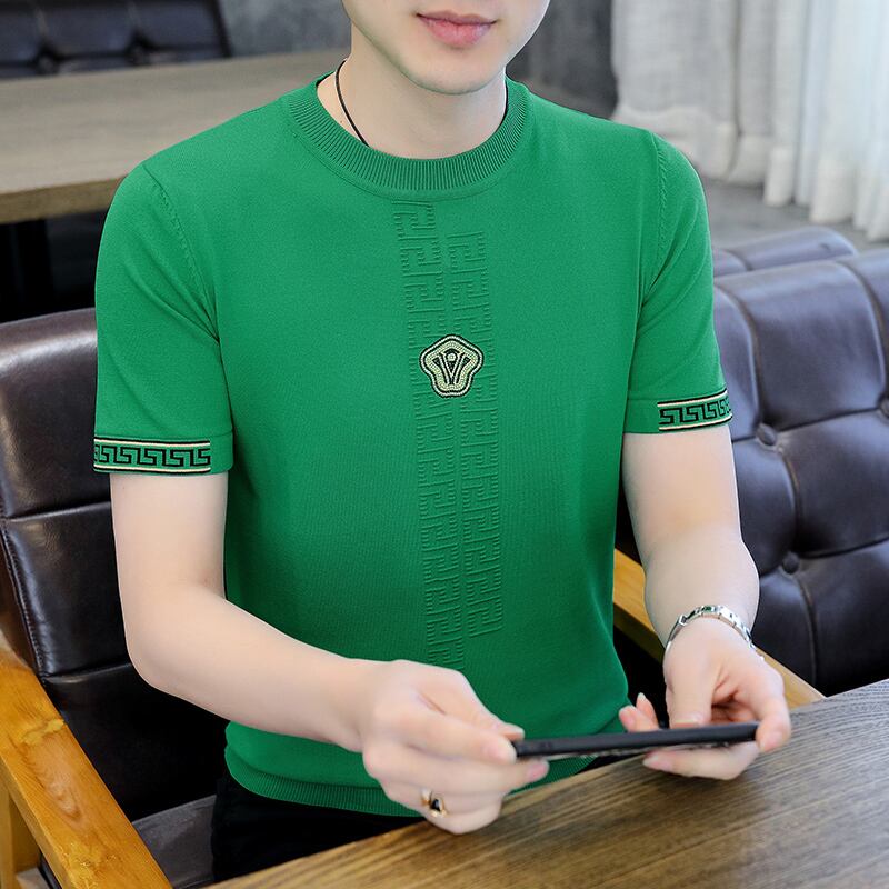 Summer thin ice silk knitted short-sleeved T-shirt men's youth casual tide brand trend half-sleeve t-shirt men's clothes カジュアル サマー 夏物 シルク Tシャツ doushi90042836992