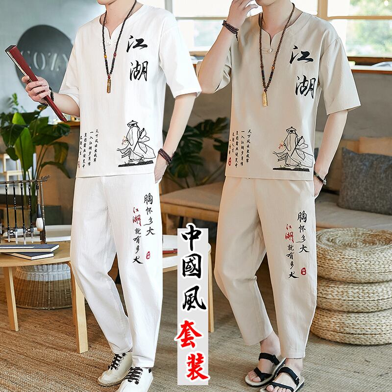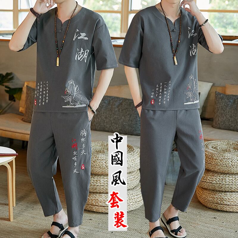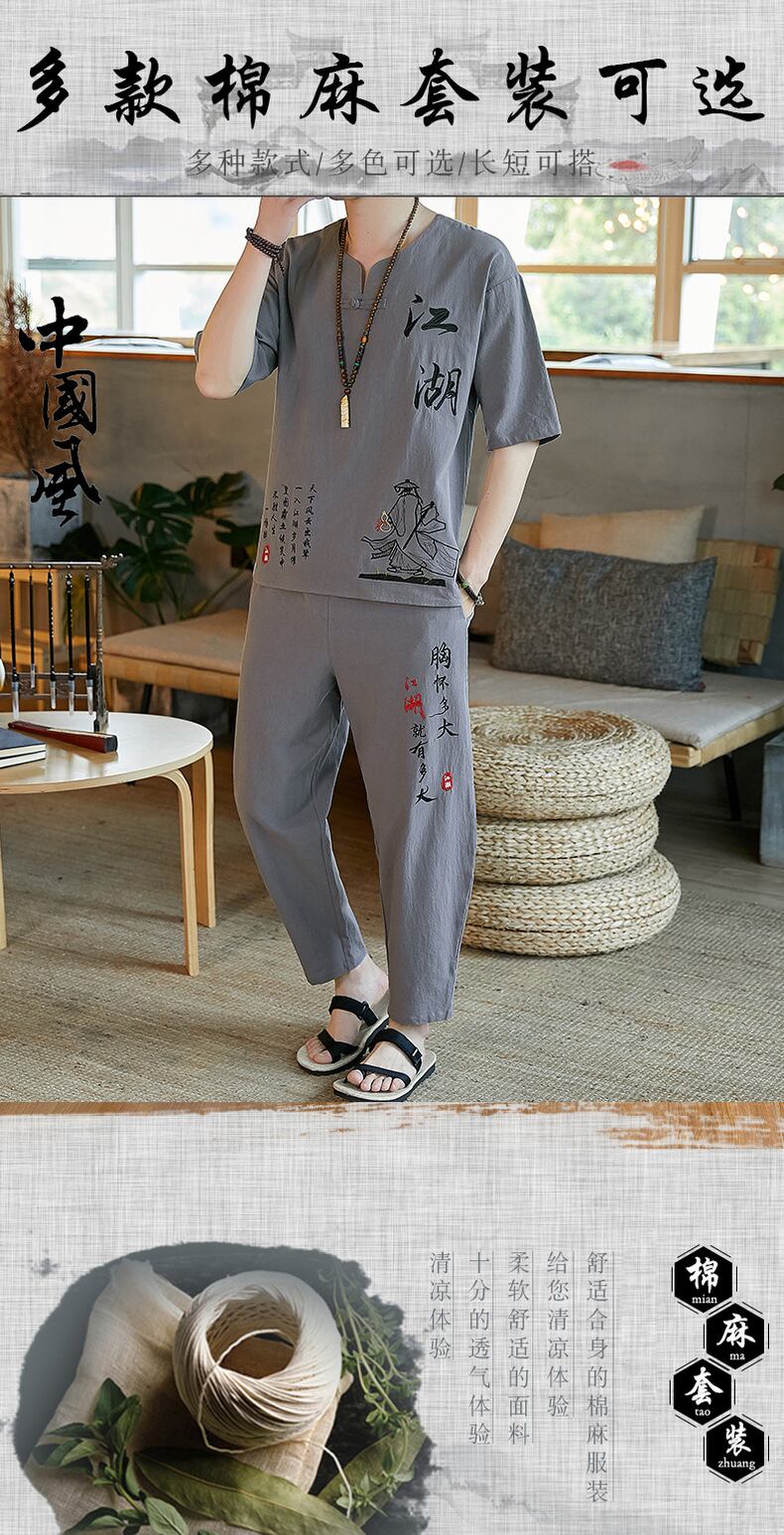 Summer Chinese style linen suit men's retro cotton and linen short-sleeved t-shirt ancient style clothes men's clothing Tang clothing Hanfu ancient clothing コットン レトロ サマー 夏物 Tシャツ doushi79900276061
