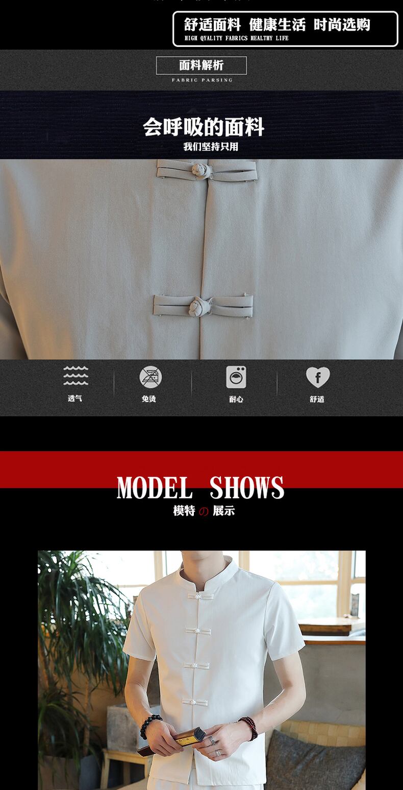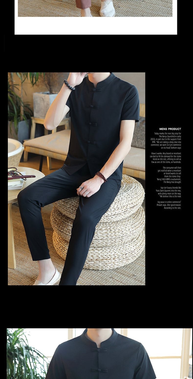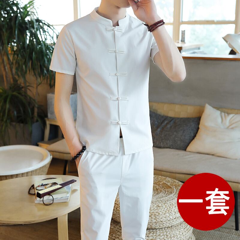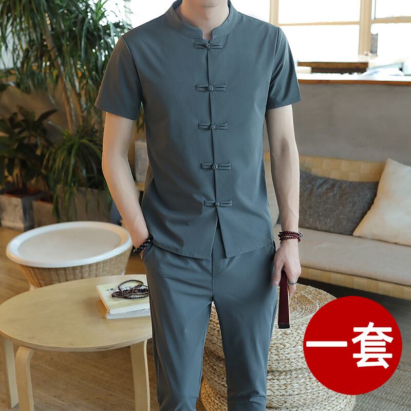 Men's short-sleeved stand-up collar t-shirt suit summer ice silk Chinese style Hanfu Tang suit retro cotton linen with a set of men's T コットン レトロ サマー 夏物 シルク Tシャツ doushi77901233760