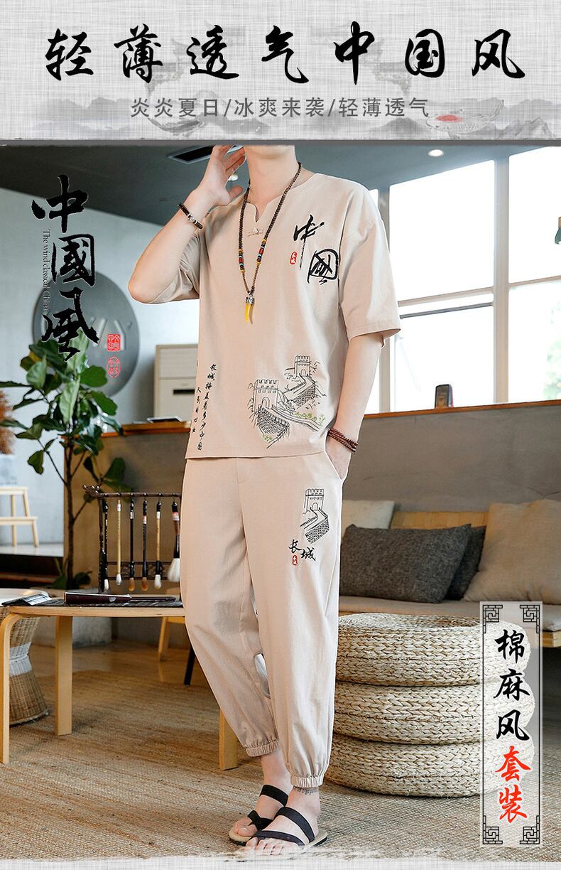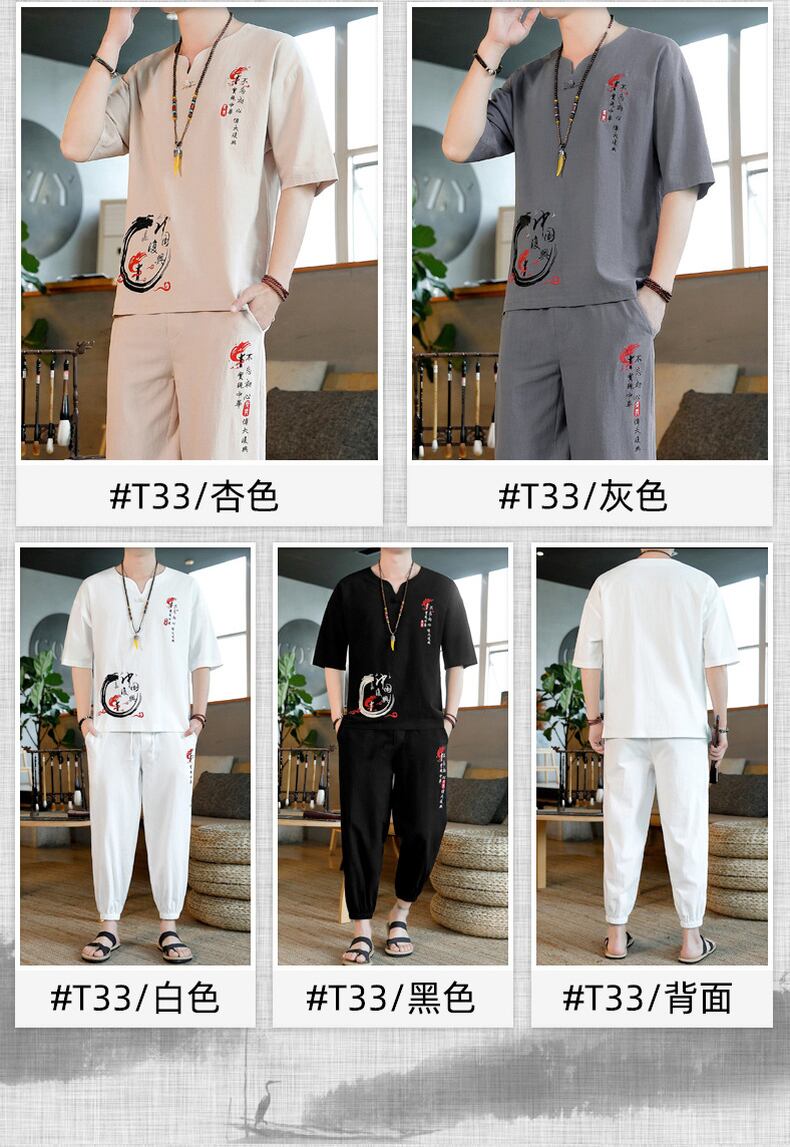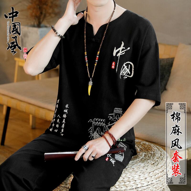 Chinese style men's summer cotton and linen short-sleeved t-shirt suit loose linen Tang suit 2022 new men's Hanfu trend コットン サマー 夏物 Tシャツ doushi17751650934