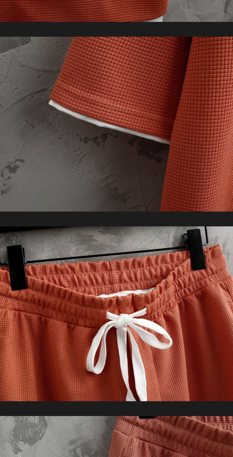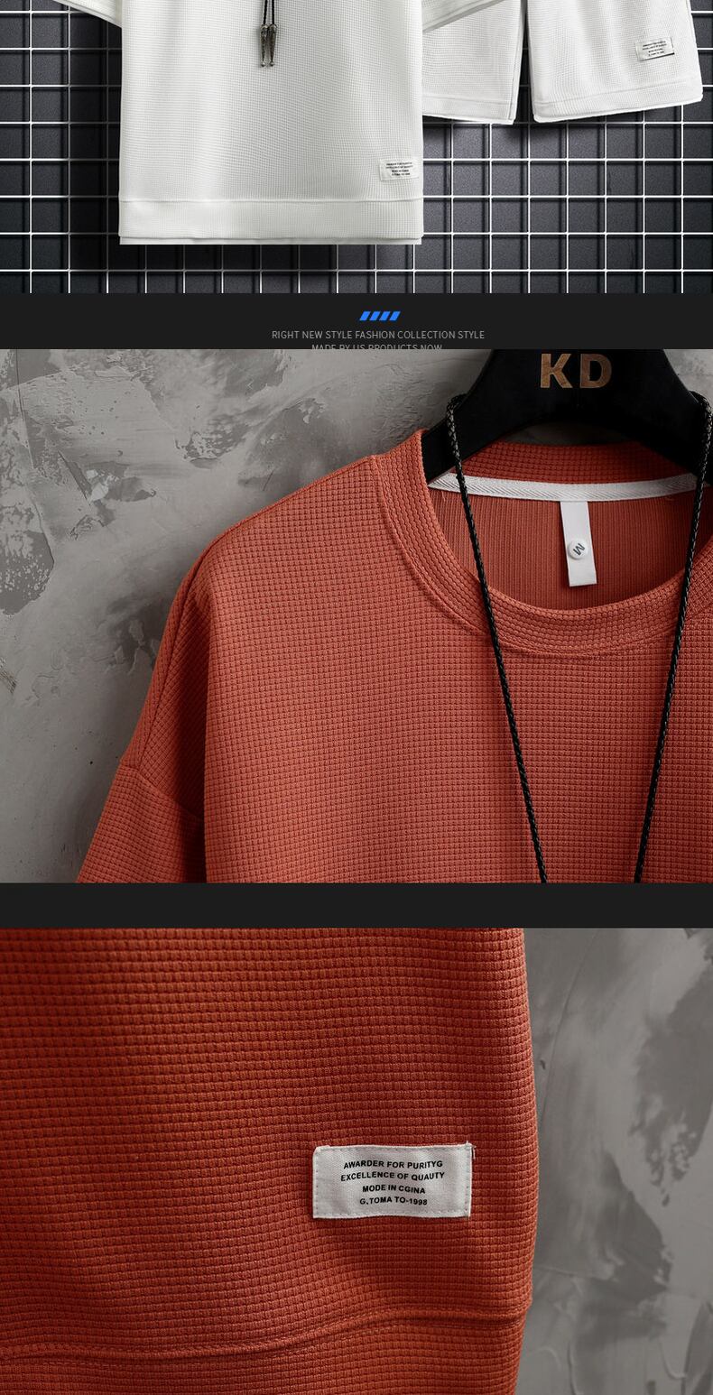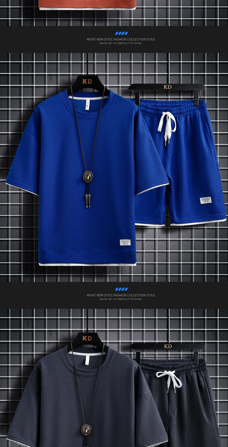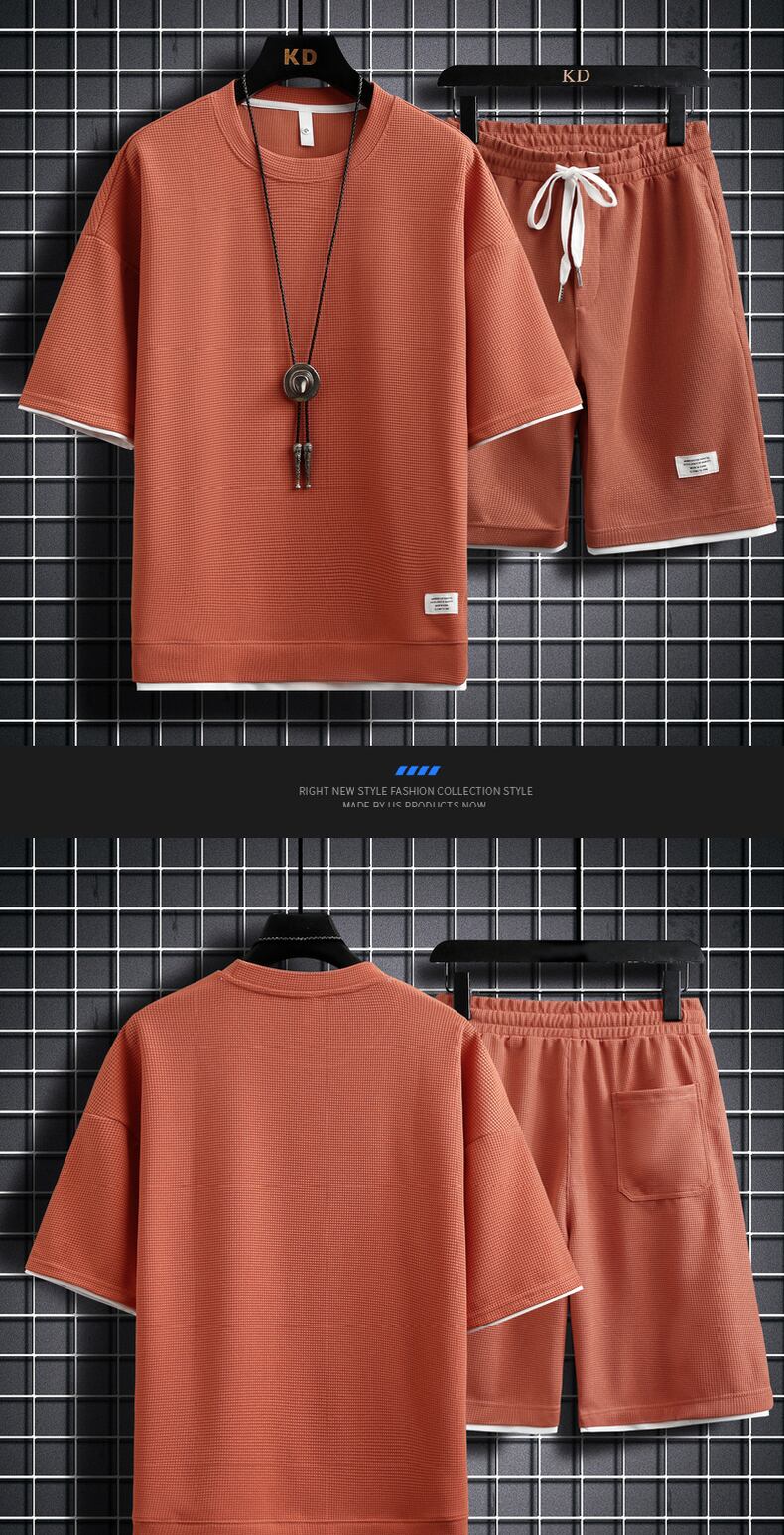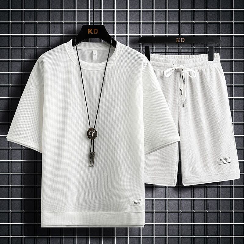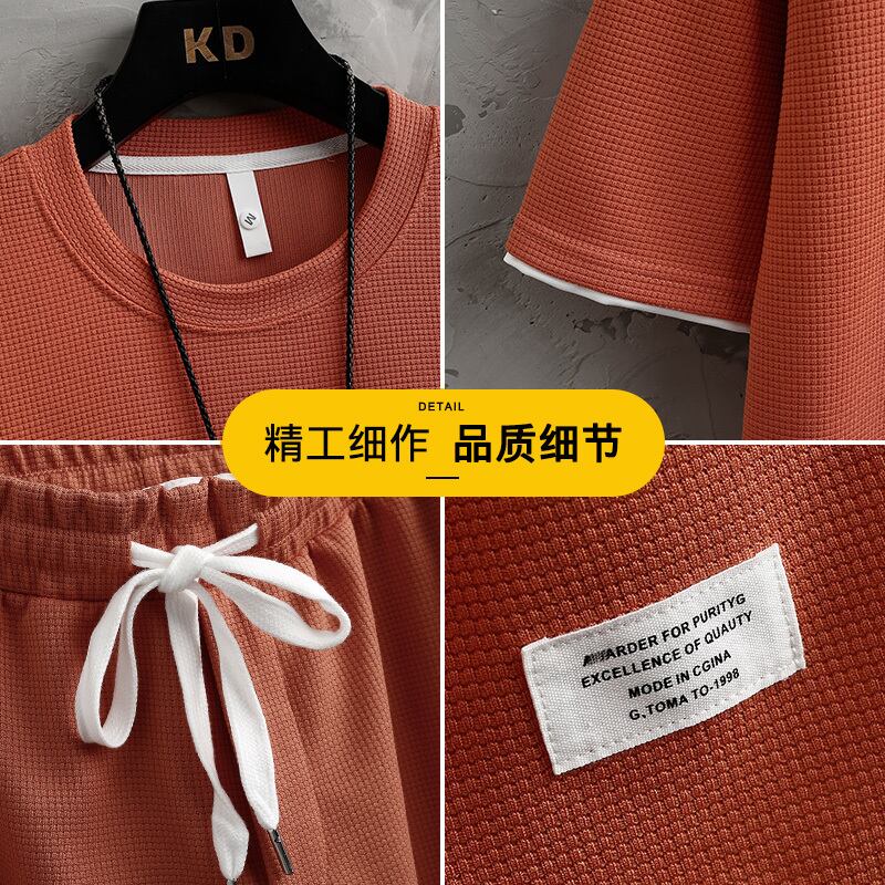 Short-sleeved t-shirt men's 2022 new summer tide brand loose collocation handsome waffle casual sports suit men カジュアル サマー 夏物 Tシャツ doushi2613325088