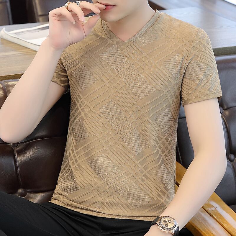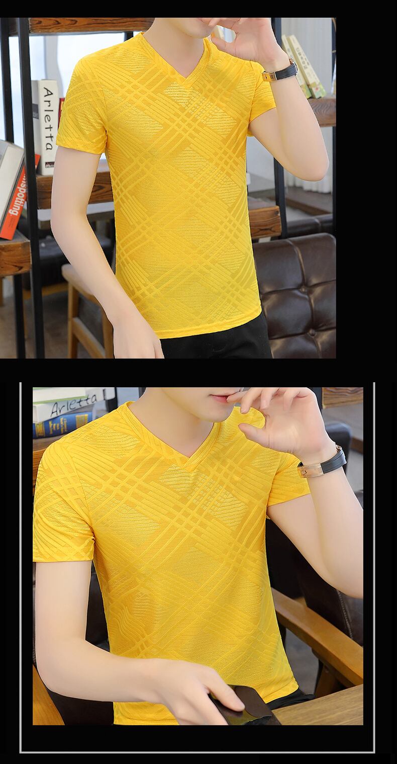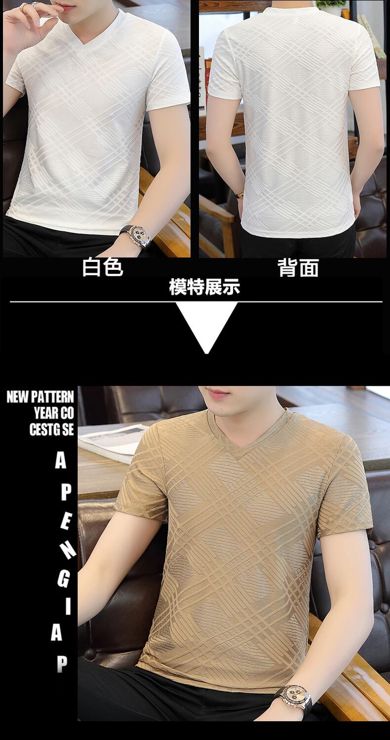 Ice silk short-sleeved T-shirt men's summer thin V-neck hollow half-sleeved undershirt trend slim solid color summer clothes サマー 夏物 Vネック スリム シルク Tシャツ ソリッドカラー doushi51780636193