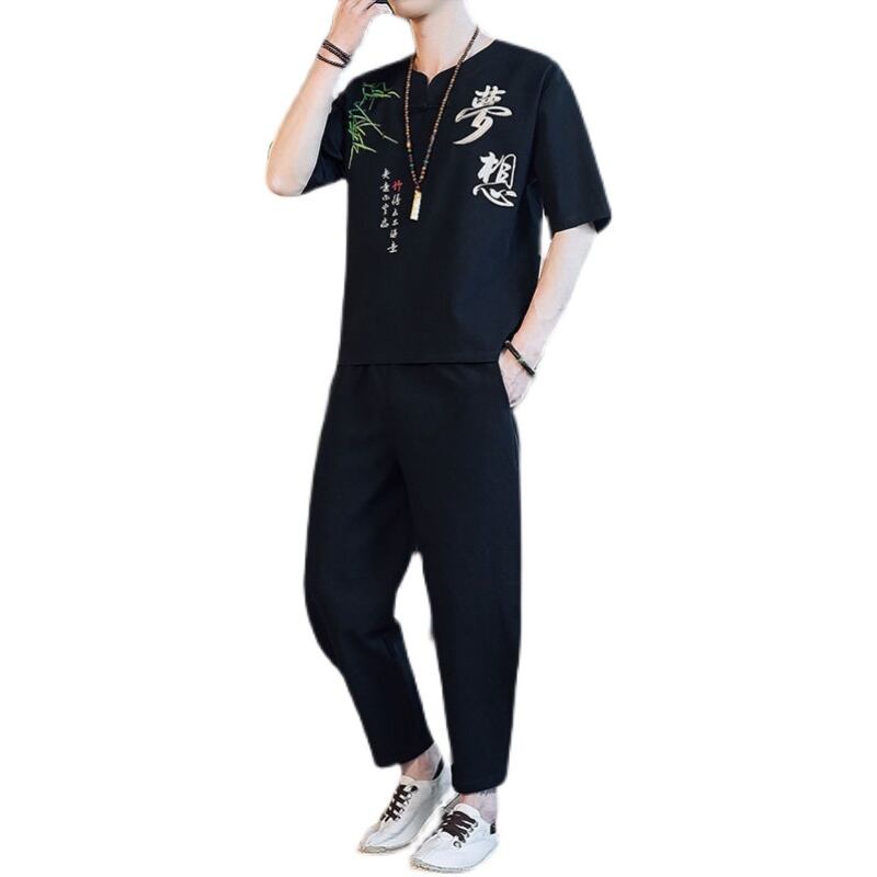 Summer plus fertilizer to increase Chinese style suit men's large size loose casual cotton and linen suit embroidery short-sleeved two-piece suit コットン カジュアル 刺繍 大きめサイズ サマー 夏物 doushi72709418561